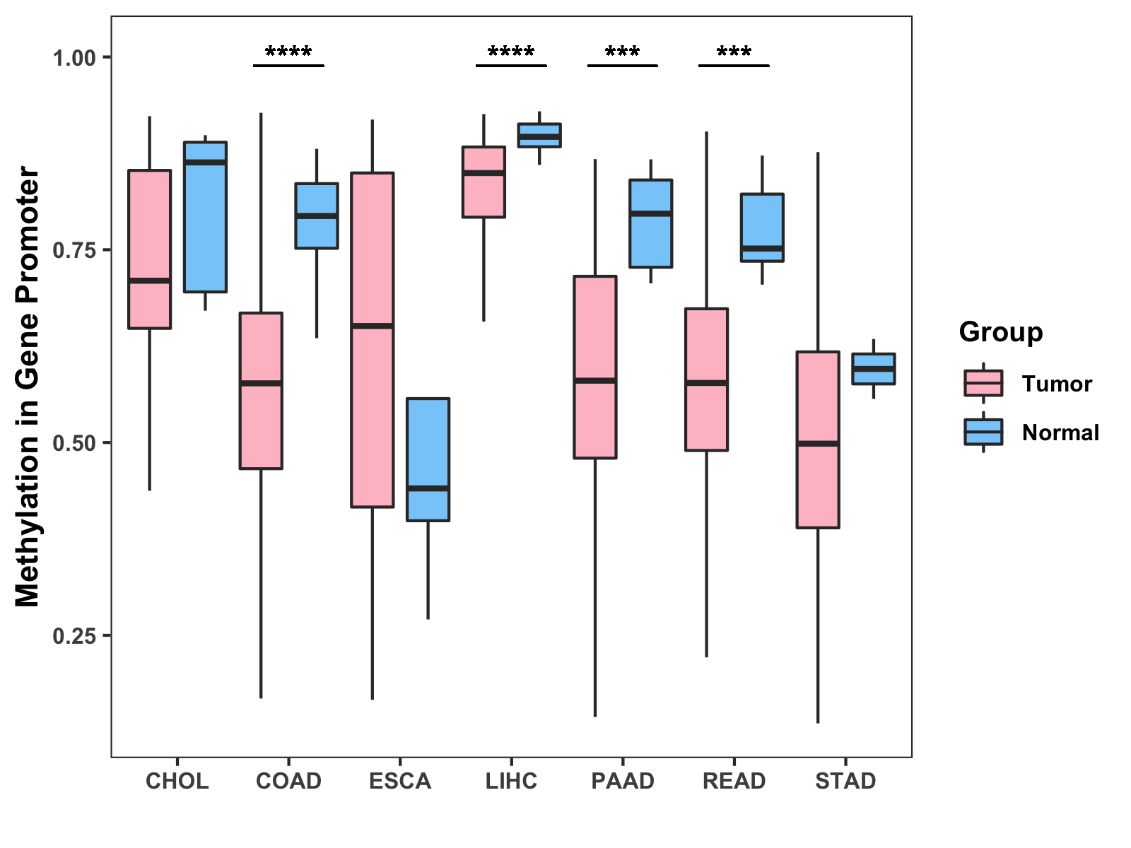 Boxplot of All Gastrointestinal Cancer ( * : 0.01-0.05 , ** : 0.005-0.01 , *** : 0.0001-0.005 , **** : < 0.0001 ) |