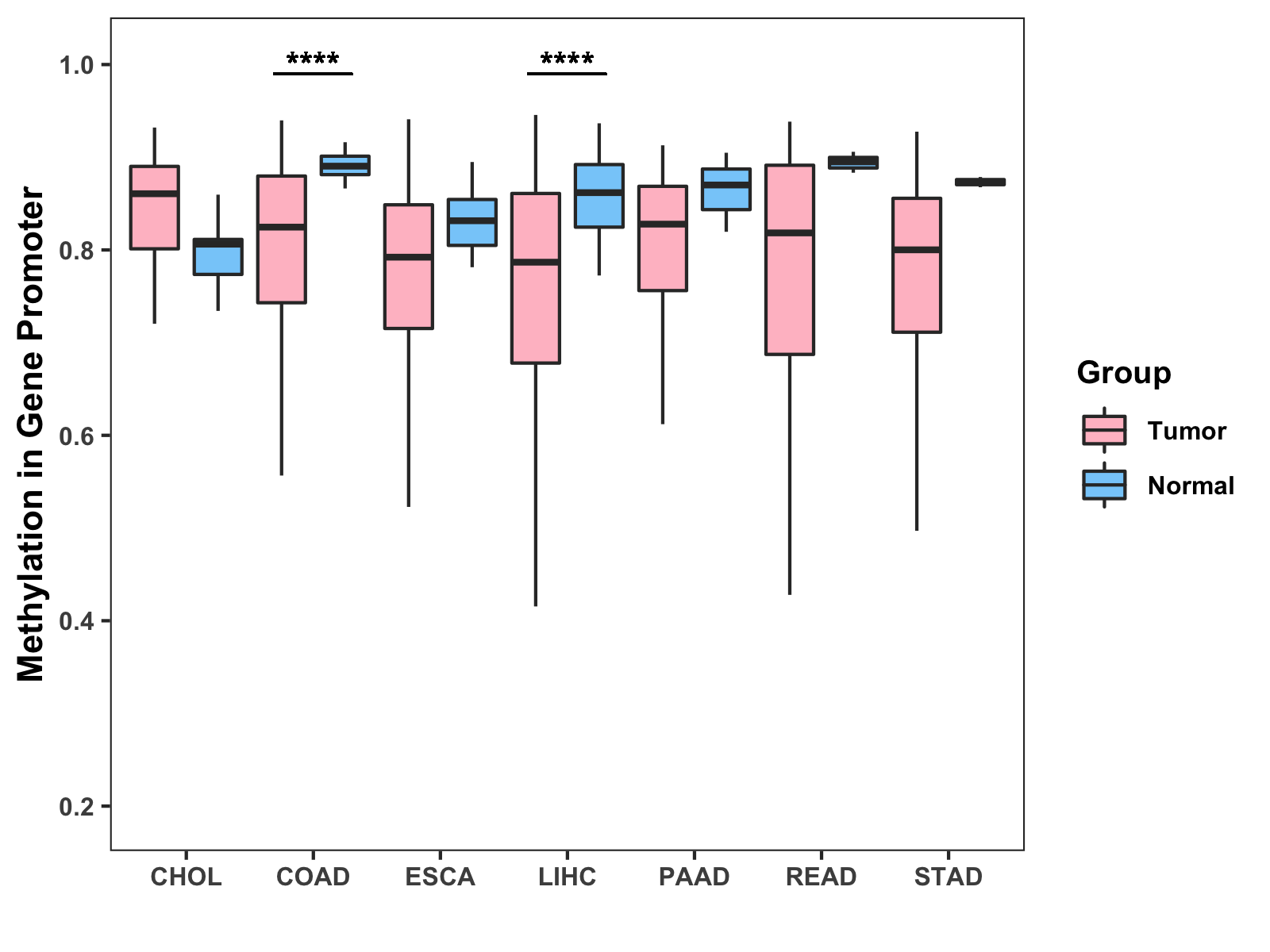 Boxplot of All Gastrointestinal Cancer ( * : 0.01-0.05 , ** : 0.005-0.01 , *** : 0.0001-0.005 , **** : < 0.0001 ) |