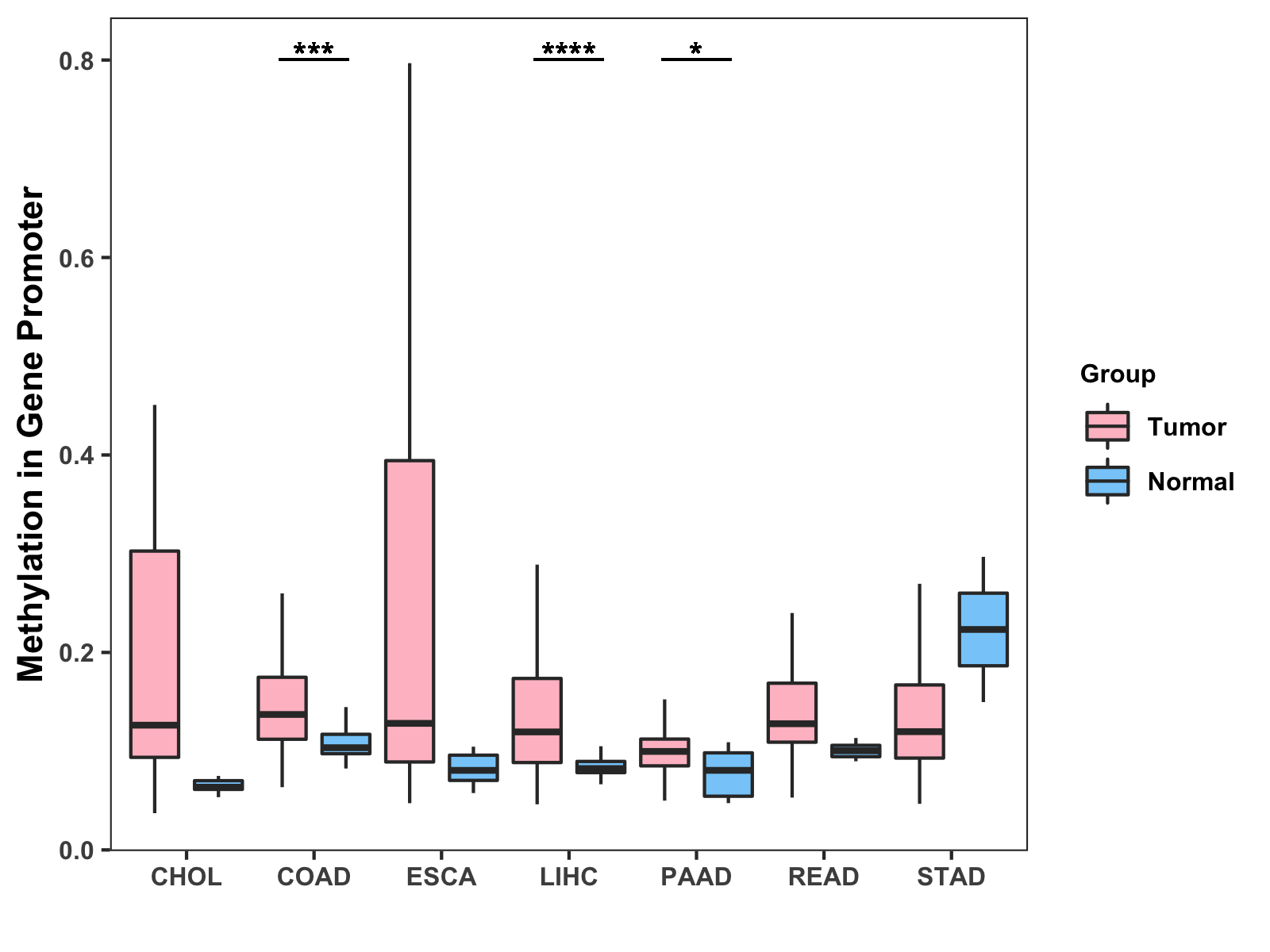 Boxplot of All Gastrointestinal Cancer ( * : 0.01-0.05 , ** : 0.005-0.01 , *** : 0.0001-0.005 , **** : < 0.0001 ) |