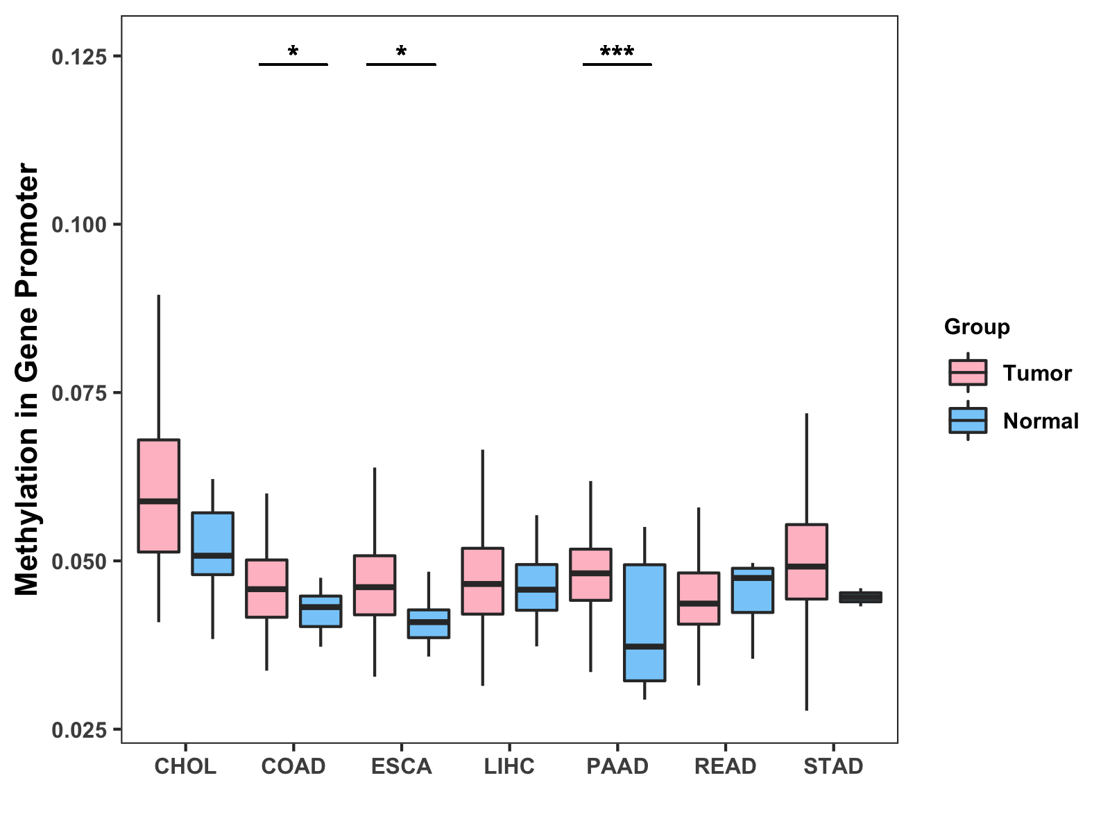 Boxplot of All Gastrointestinal Cancer ( * : 0.01-0.05 , ** : 0.005-0.01 , *** : 0.0001-0.005 , **** : < 0.0001 ) |