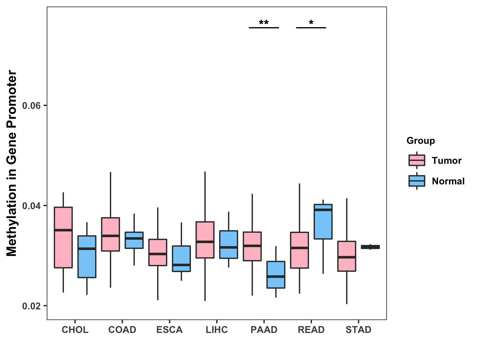 Boxplot of All Gastrointestinal Cancer ( * : 0.01-0.05 , ** : 0.005-0.01 , *** : 0.0001-0.005 , **** : < 0.0001 ) |