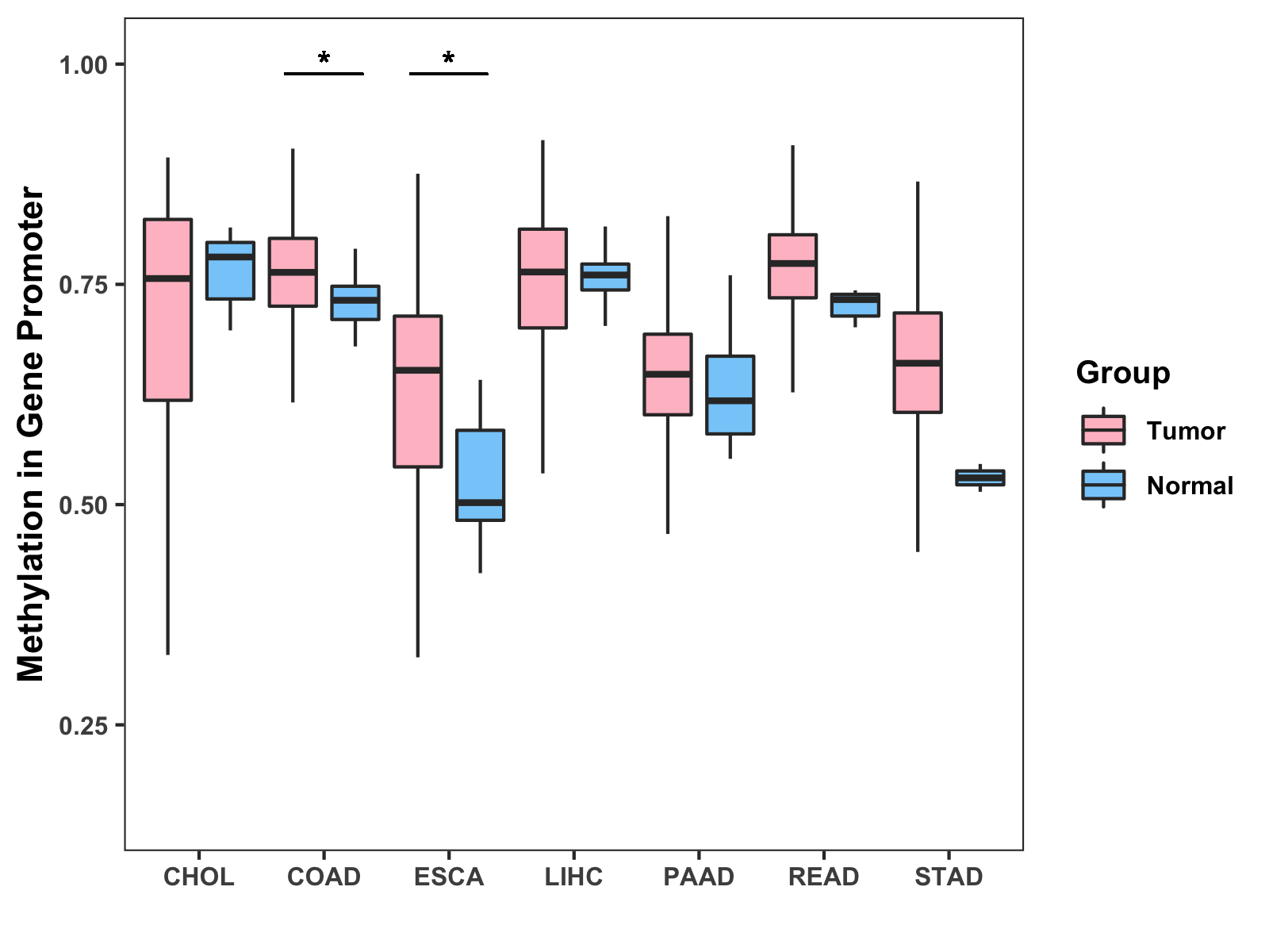 Boxplot of All Gastrointestinal Cancer ( * : 0.01-0.05 , ** : 0.005-0.01 , *** : 0.0001-0.005 , **** : < 0.0001 ) |