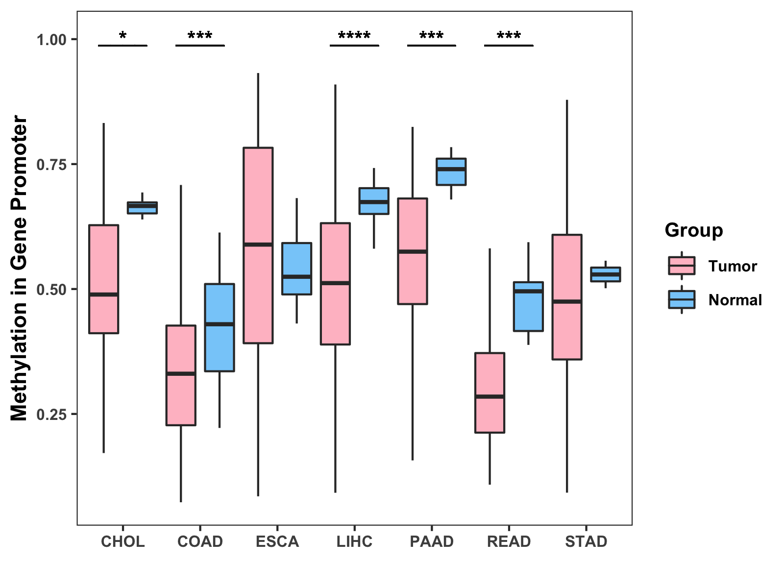 Boxplot of All Gastrointestinal Cancer ( * : 0.01-0.05 , ** : 0.005-0.01 , *** : 0.0001-0.005 , **** : < 0.0001 ) |