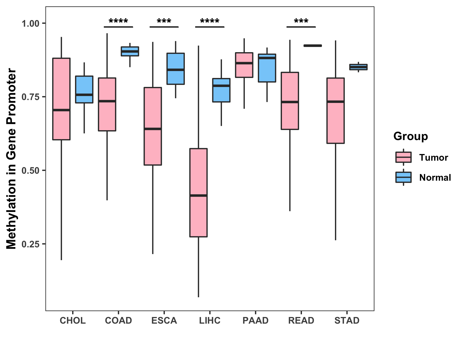 Boxplot of All Gastrointestinal Cancer ( * : 0.01-0.05 , ** : 0.005-0.01 , *** : 0.0001-0.005 , **** : < 0.0001 ) |