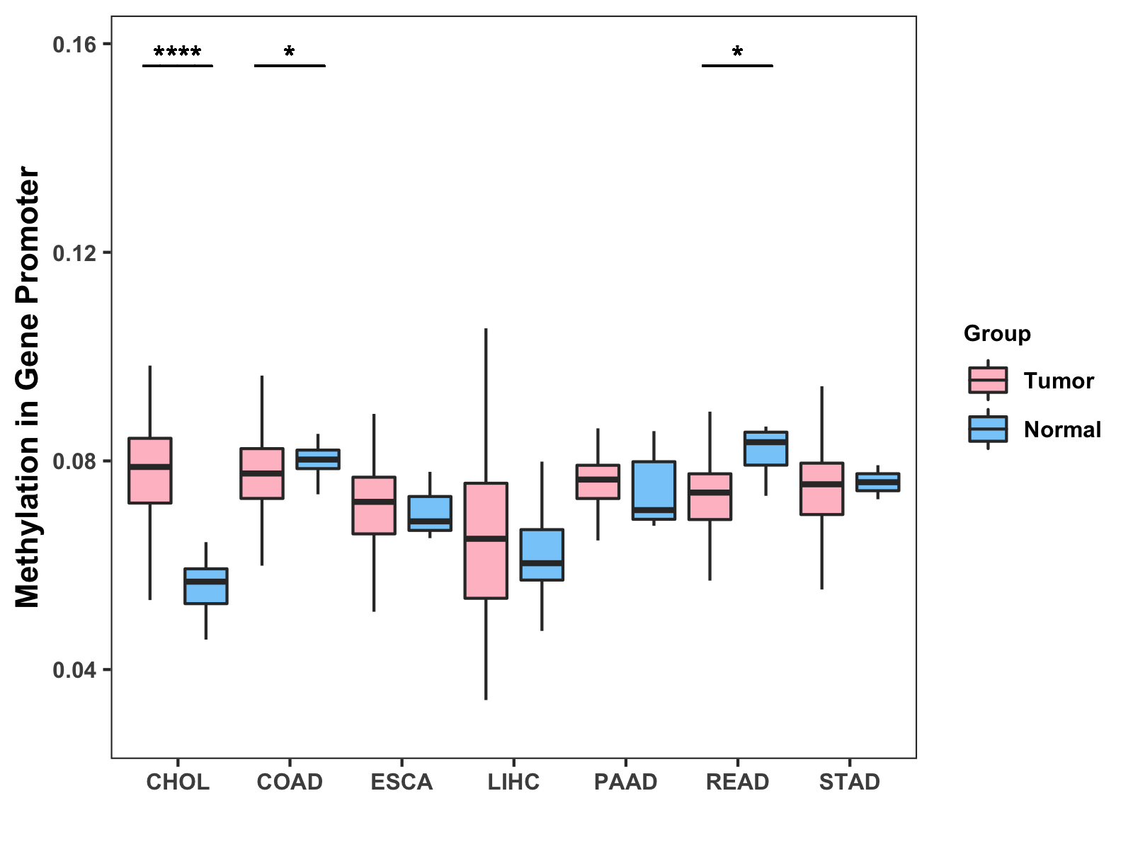 Boxplot of All Gastrointestinal Cancer ( * : 0.01-0.05 , ** : 0.005-0.01 , *** : 0.0001-0.005 , **** : < 0.0001 ) |