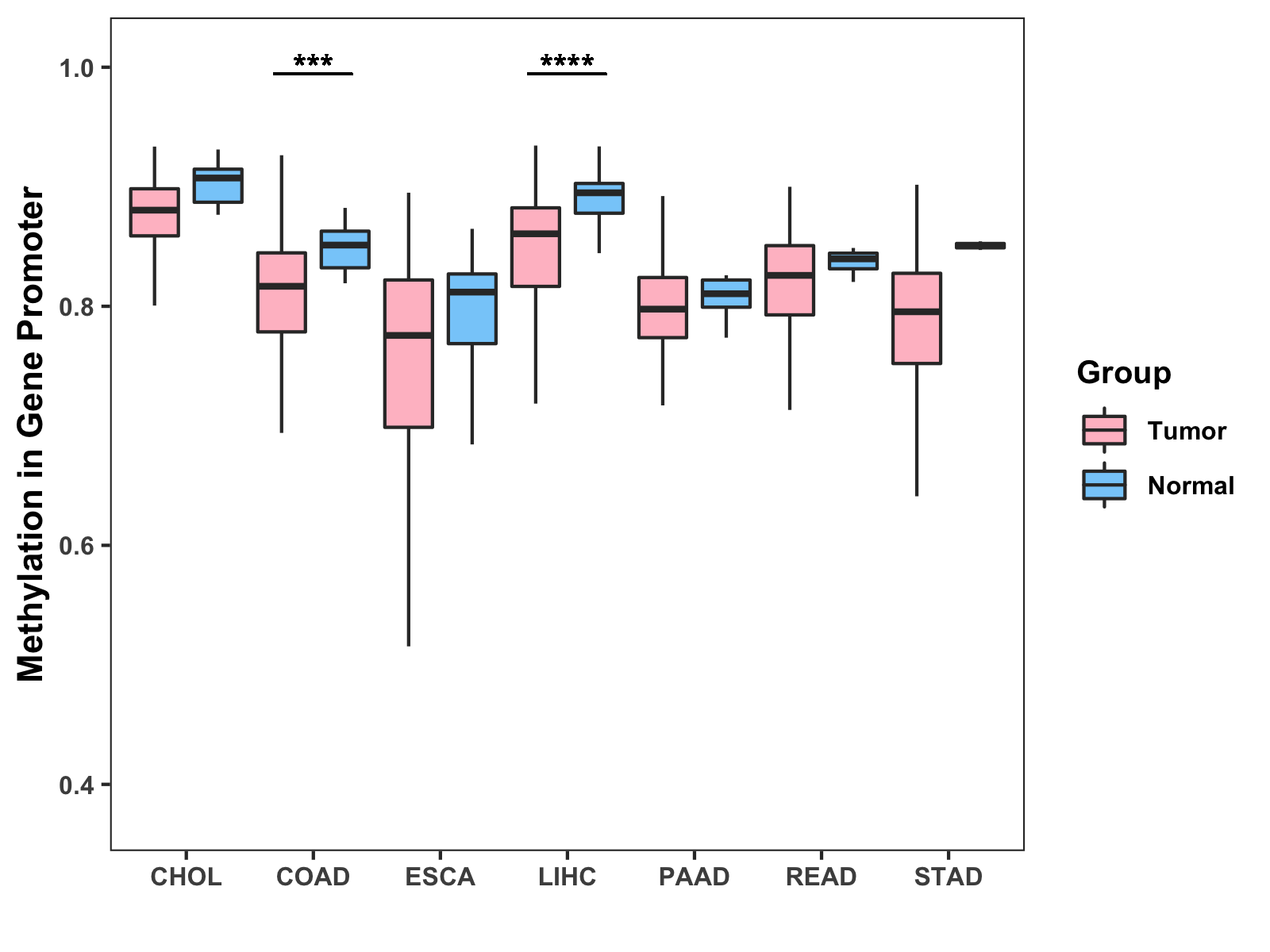 Boxplot of All Gastrointestinal Cancer ( * : 0.01-0.05 , ** : 0.005-0.01 , *** : 0.0001-0.005 , **** : < 0.0001 ) |