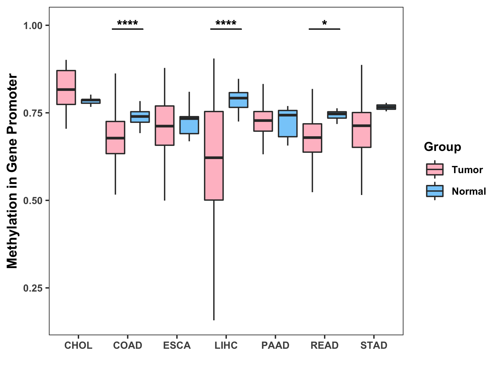 Boxplot of All Gastrointestinal Cancer ( * : 0.01-0.05 , ** : 0.005-0.01 , *** : 0.0001-0.005 , **** : < 0.0001 ) |
