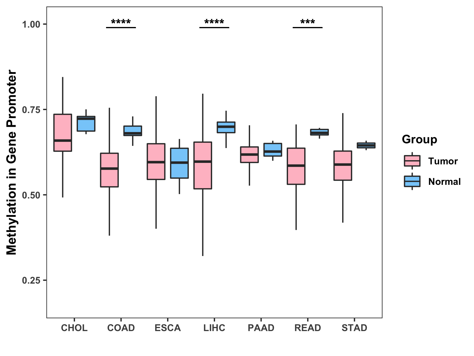 Boxplot of All Gastrointestinal Cancer ( * : 0.01-0.05 , ** : 0.005-0.01 , *** : 0.0001-0.005 , **** : < 0.0001 ) |