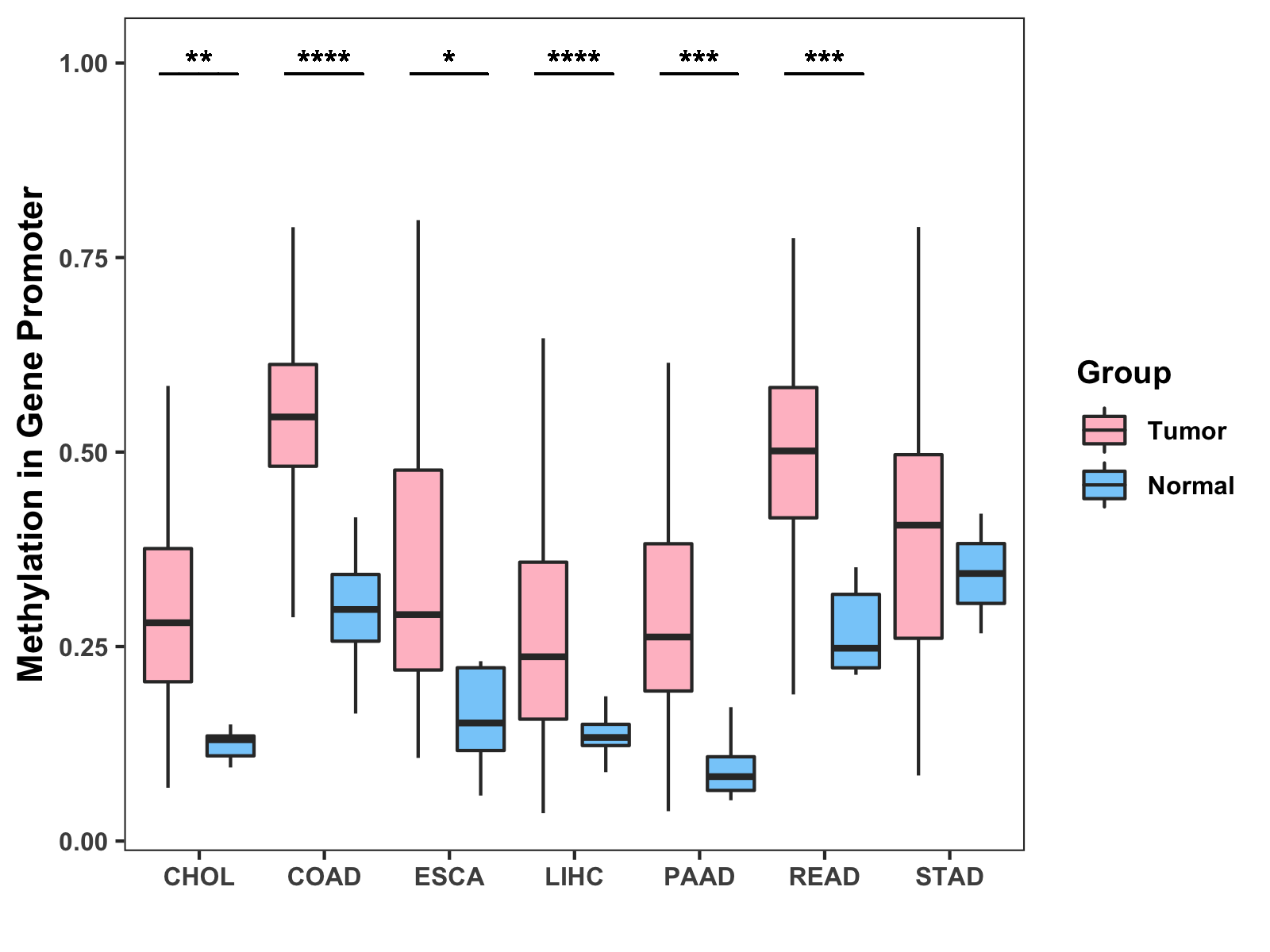 Boxplot of All Gastrointestinal Cancer ( * : 0.01-0.05 , ** : 0.005-0.01 , *** : 0.0001-0.005 , **** : < 0.0001 ) |