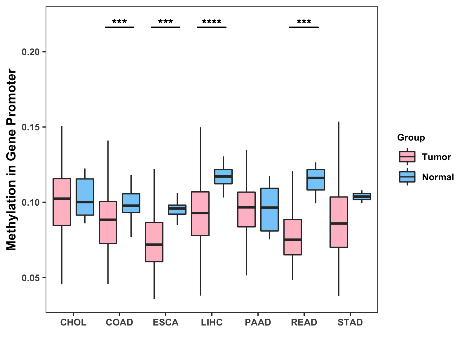 Boxplot of All Gastrointestinal Cancer ( * : 0.01-0.05 , ** : 0.005-0.01 , *** : 0.0001-0.005 , **** : < 0.0001 ) |