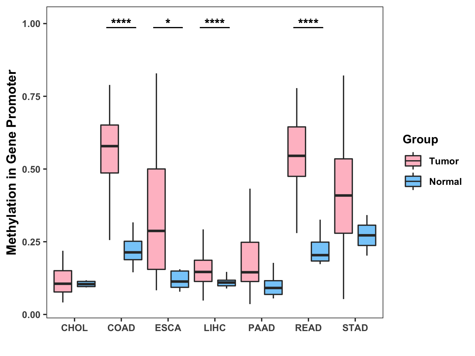 Boxplot of All Gastrointestinal Cancer ( * : 0.01-0.05 , ** : 0.005-0.01 , *** : 0.0001-0.005 , **** : < 0.0001 ) |