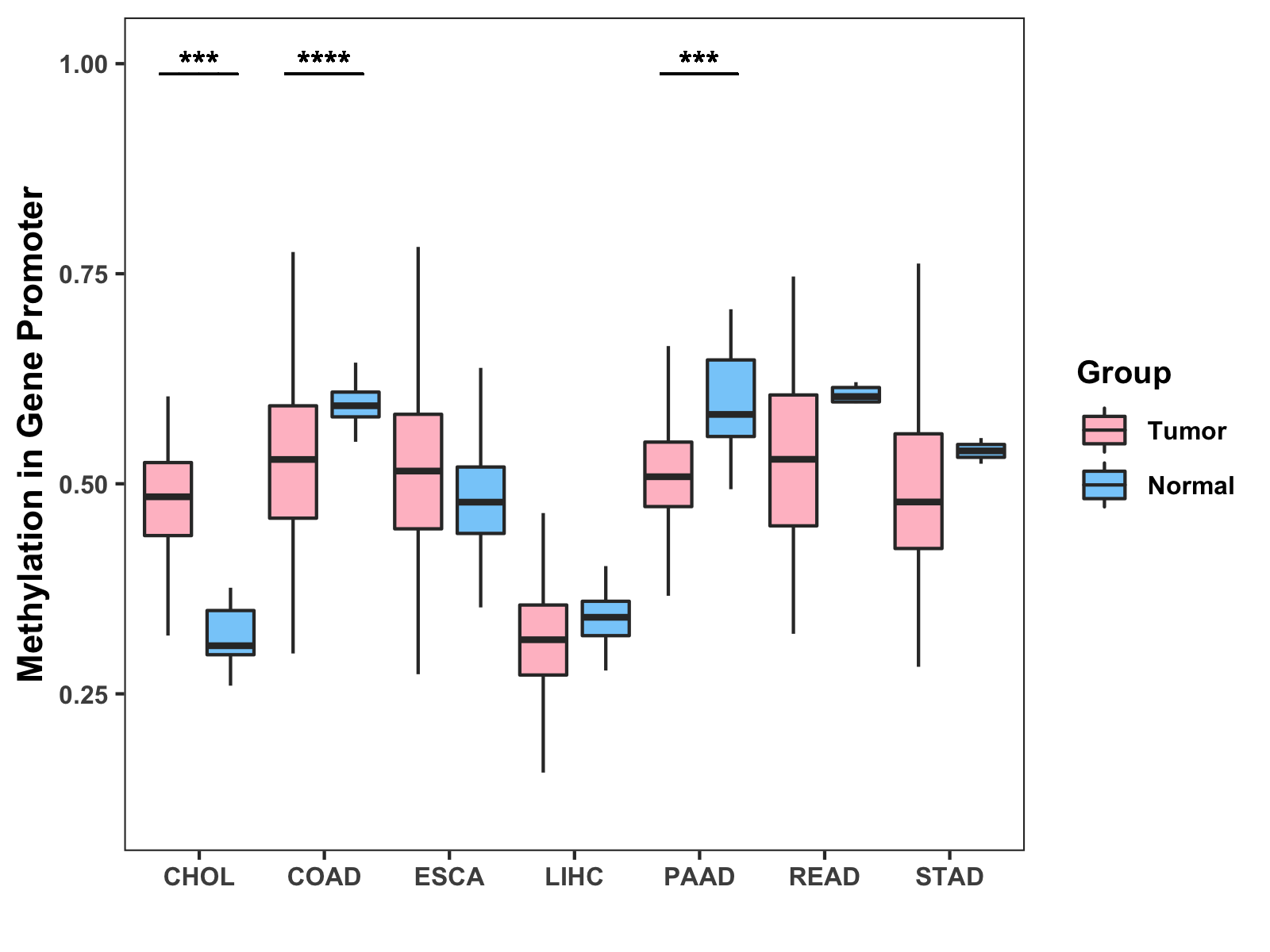 Boxplot of All Gastrointestinal Cancer ( * : 0.01-0.05 , ** : 0.005-0.01 , *** : 0.0001-0.005 , **** : < 0.0001 ) |