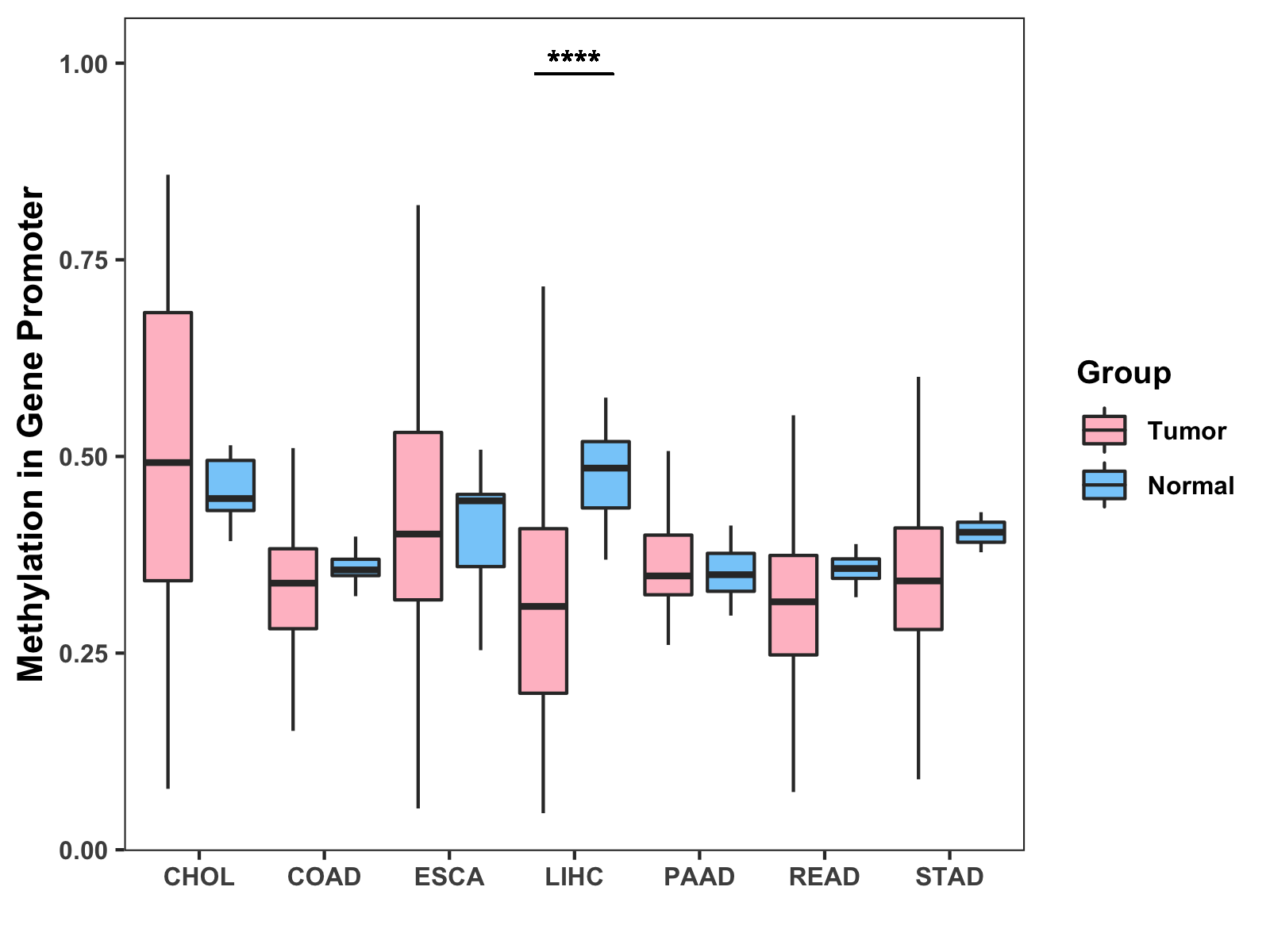 Boxplot of All Gastrointestinal Cancer ( * : 0.01-0.05 , ** : 0.005-0.01 , *** : 0.0001-0.005 , **** : < 0.0001 ) |