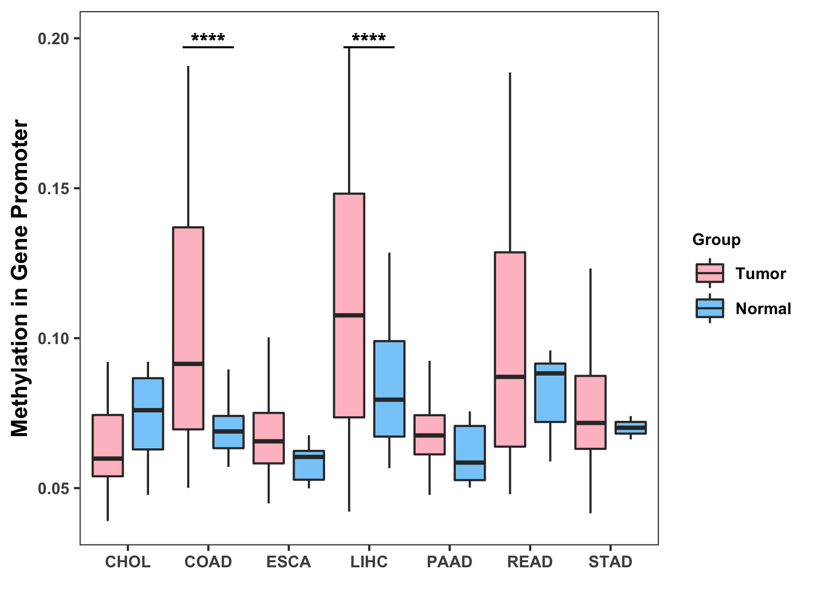 Boxplot of All Gastrointestinal Cancer ( * : 0.01-0.05 , ** : 0.005-0.01 , *** : 0.0001-0.005 , **** : < 0.0001 ) |