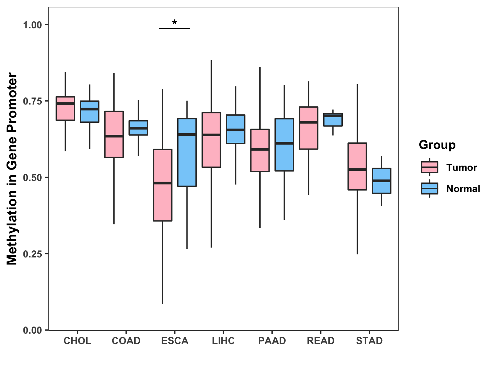 Boxplot of All Gastrointestinal Cancer ( * : 0.01-0.05 , ** : 0.005-0.01 , *** : 0.0001-0.005 , **** : < 0.0001 ) |