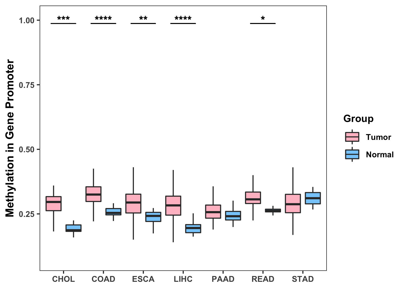 Boxplot of All Gastrointestinal Cancer ( * : 0.01-0.05 , ** : 0.005-0.01 , *** : 0.0001-0.005 , **** : < 0.0001 ) |