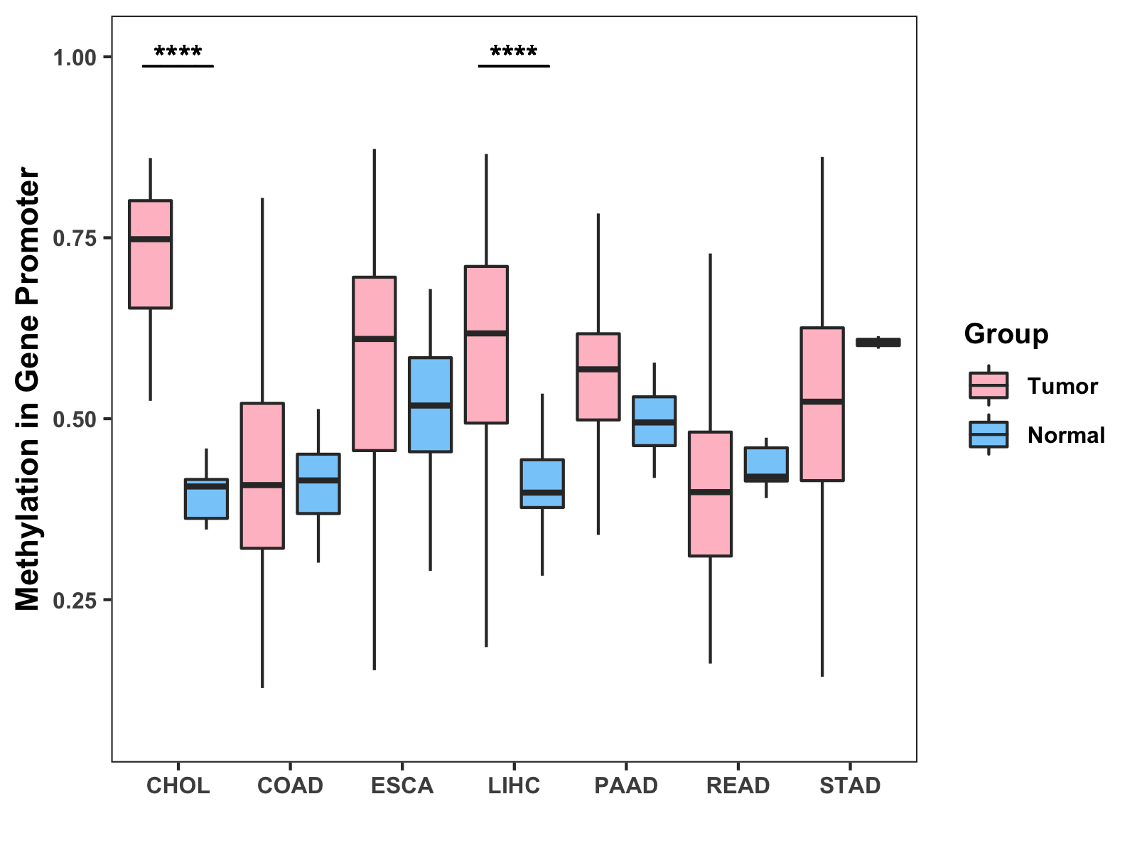 Boxplot of All Gastrointestinal Cancer ( * : 0.01-0.05 , ** : 0.005-0.01 , *** : 0.0001-0.005 , **** : < 0.0001 ) |