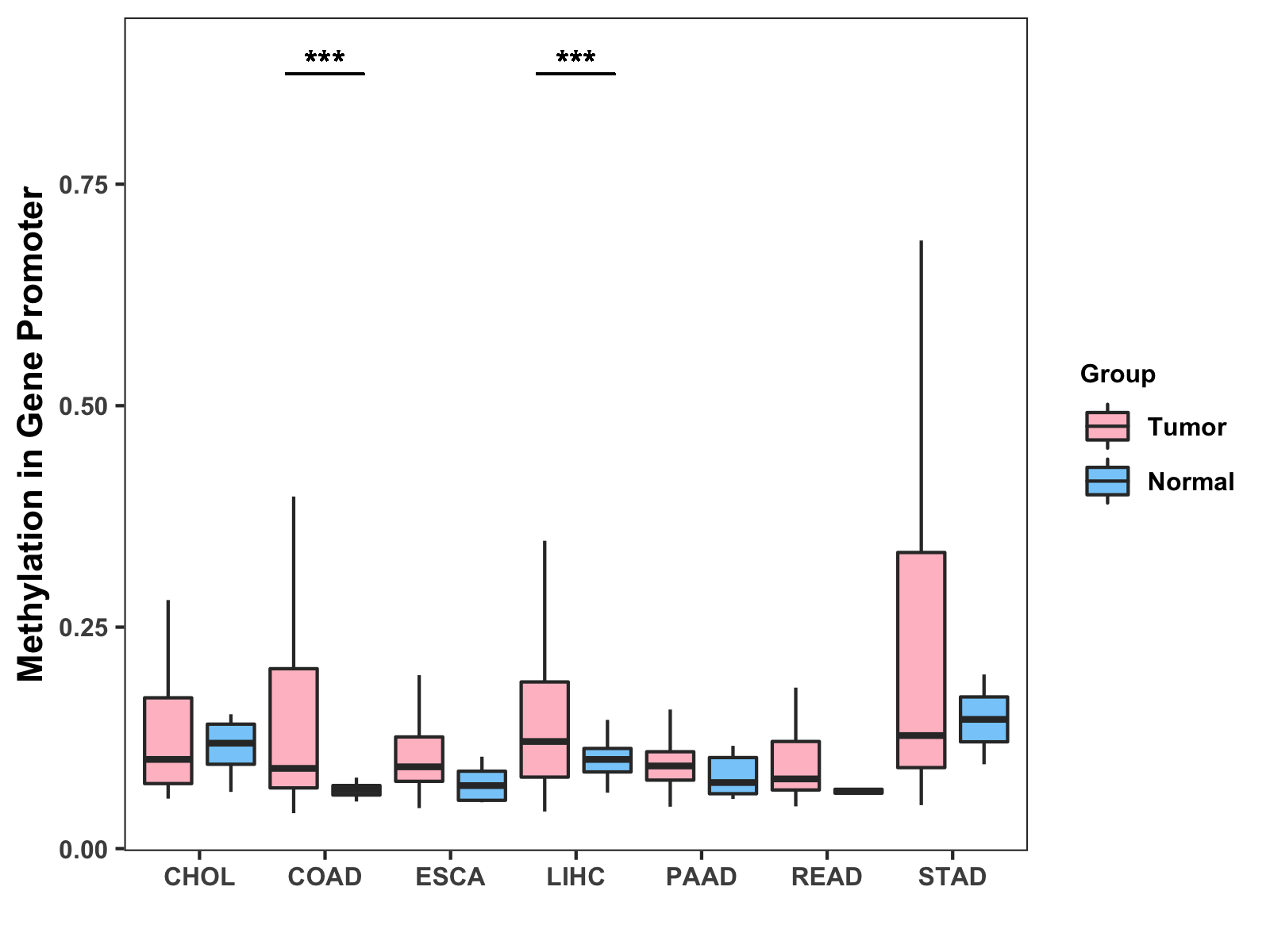 Boxplot of All Gastrointestinal Cancer ( * : 0.01-0.05 , ** : 0.005-0.01 , *** : 0.0001-0.005 , **** : < 0.0001 ) |
