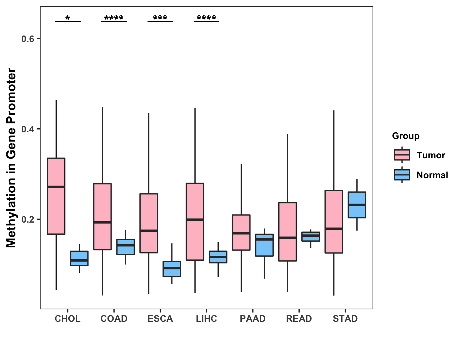 Boxplot of All Gastrointestinal Cancer ( * : 0.01-0.05 , ** : 0.005-0.01 , *** : 0.0001-0.005 , **** : < 0.0001 ) |