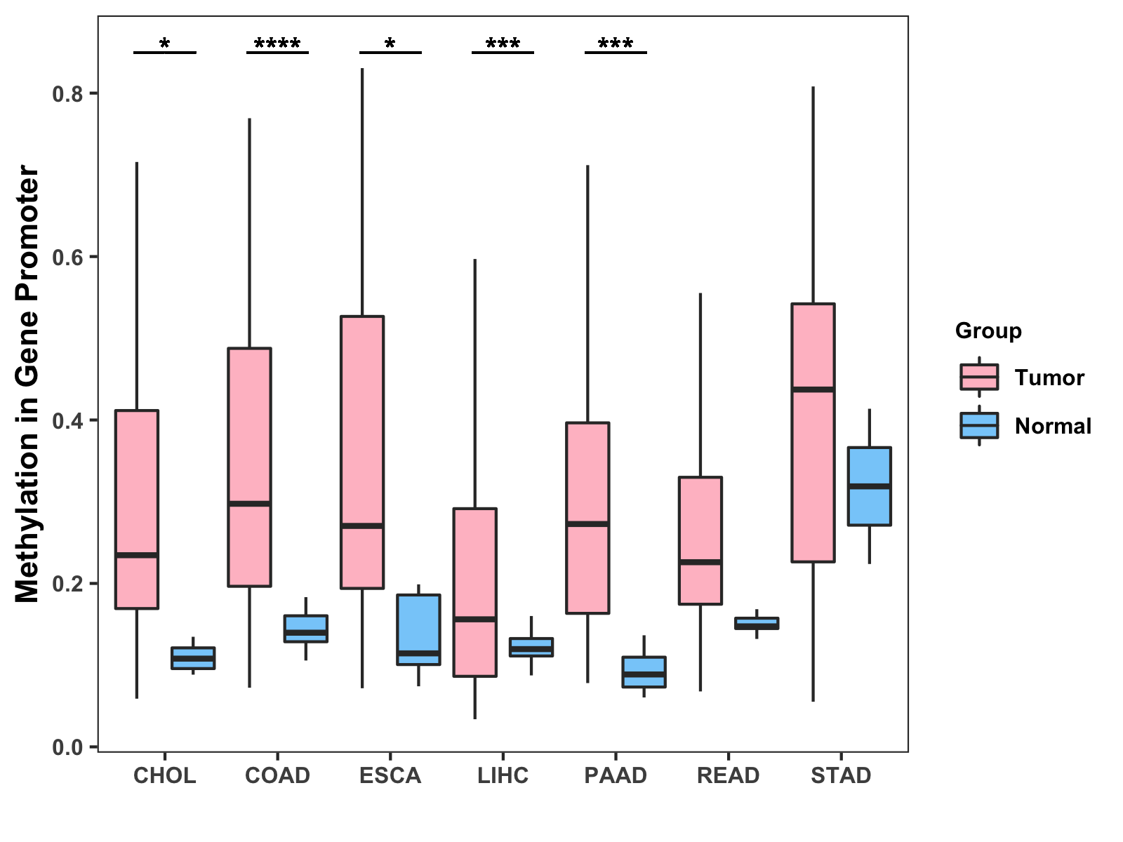 Boxplot of All Gastrointestinal Cancer ( * : 0.01-0.05 , ** : 0.005-0.01 , *** : 0.0001-0.005 , **** : < 0.0001 ) |