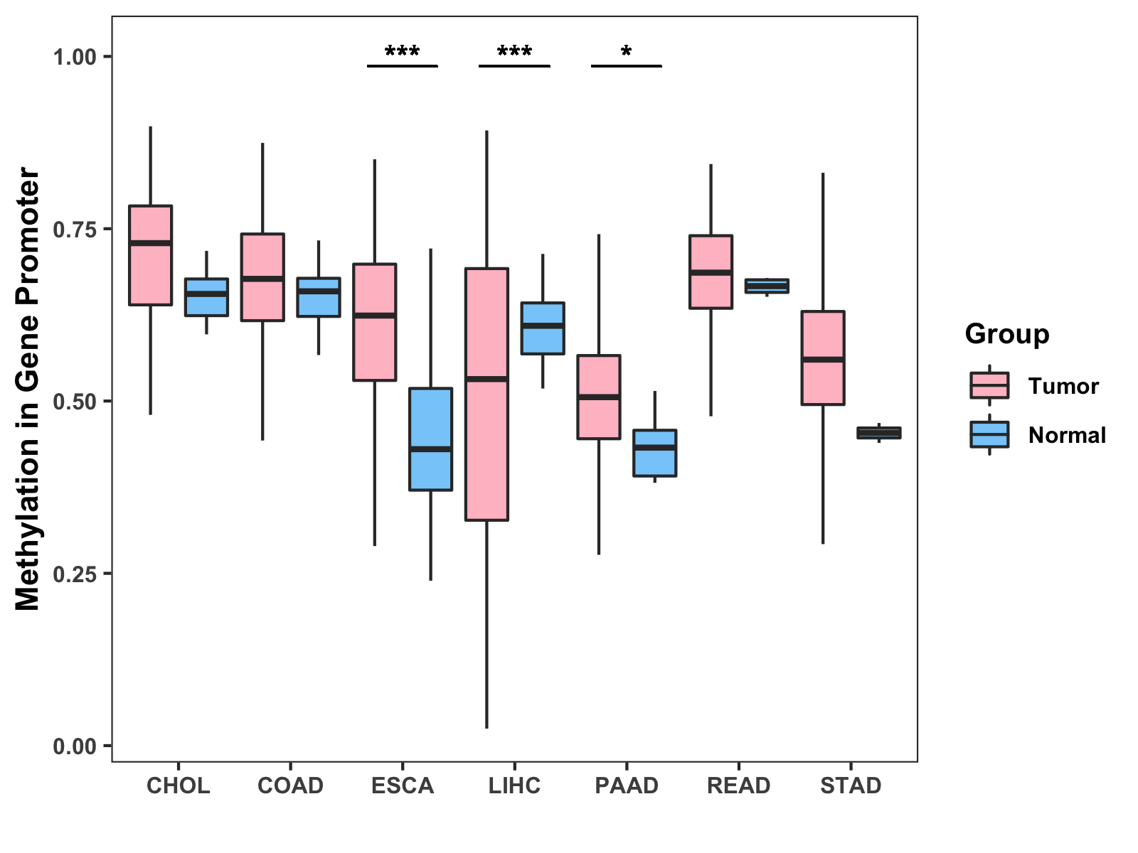 Boxplot of All Gastrointestinal Cancer ( * : 0.01-0.05 , ** : 0.005-0.01 , *** : 0.0001-0.005 , **** : < 0.0001 ) |