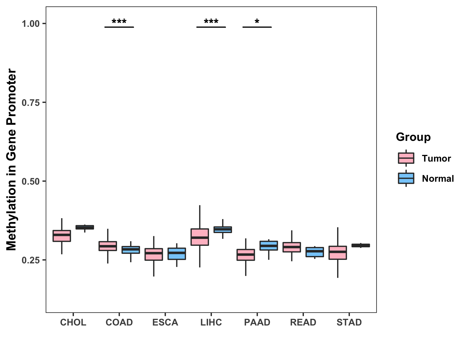 Boxplot of All Gastrointestinal Cancer ( * : 0.01-0.05 , ** : 0.005-0.01 , *** : 0.0001-0.005 , **** : < 0.0001 ) |