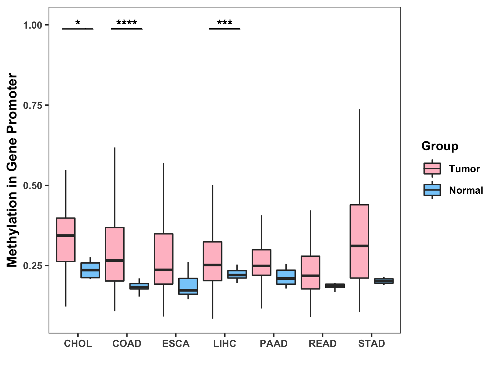 Boxplot of All Gastrointestinal Cancer ( * : 0.01-0.05 , ** : 0.005-0.01 , *** : 0.0001-0.005 , **** : < 0.0001 ) |