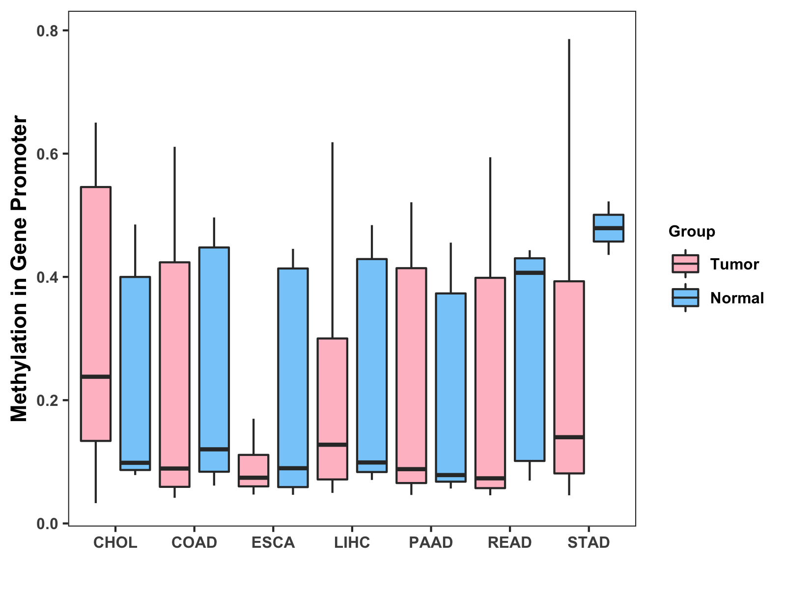 Boxplot of All Gastrointestinal Cancer ( * : 0.01-0.05 , ** : 0.005-0.01 , *** : 0.0001-0.005 , **** : < 0.0001 ) |
