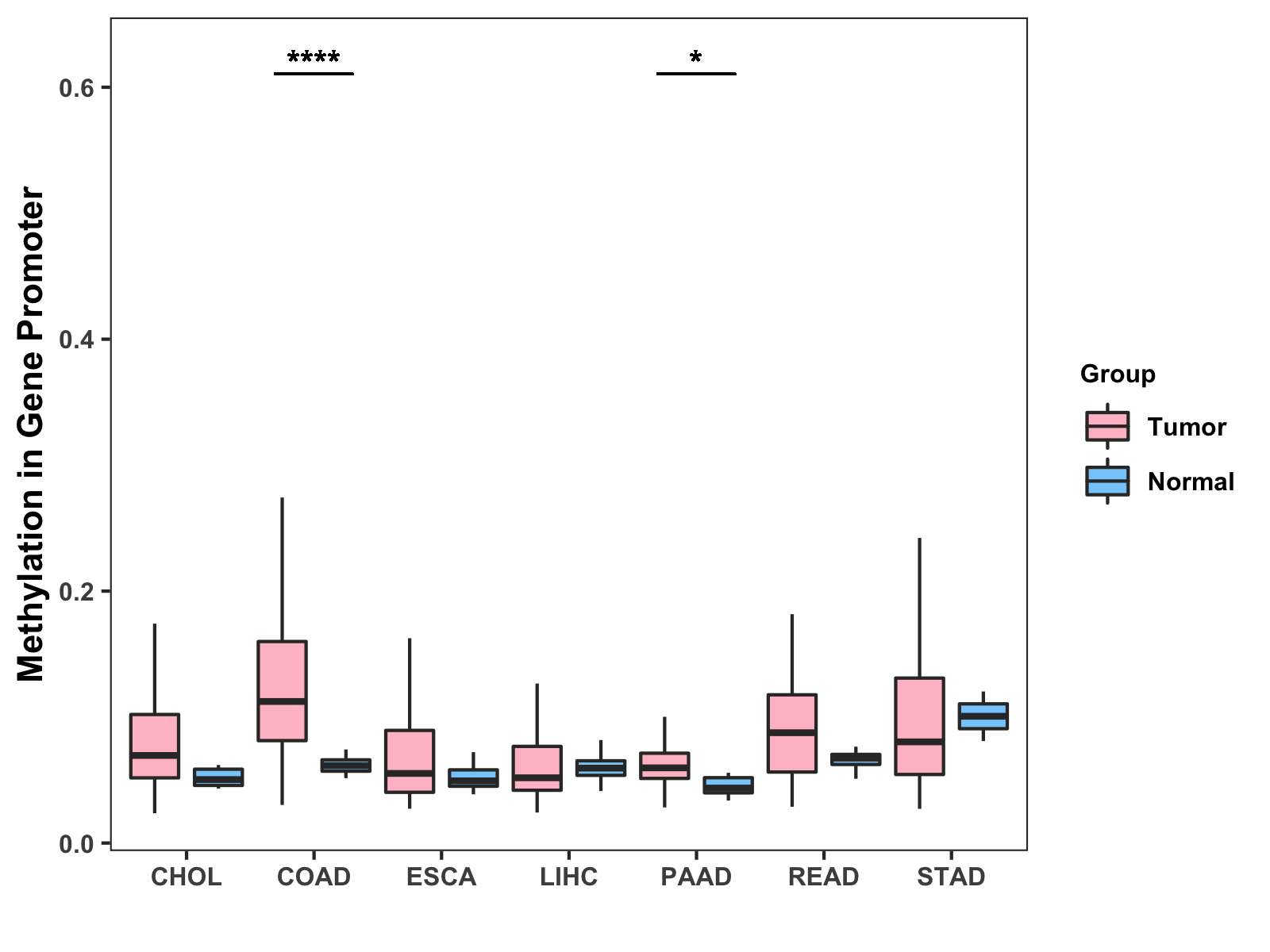 Boxplot of All Gastrointestinal Cancer ( * : 0.01-0.05 , ** : 0.005-0.01 , *** : 0.0001-0.005 , **** : < 0.0001 ) |