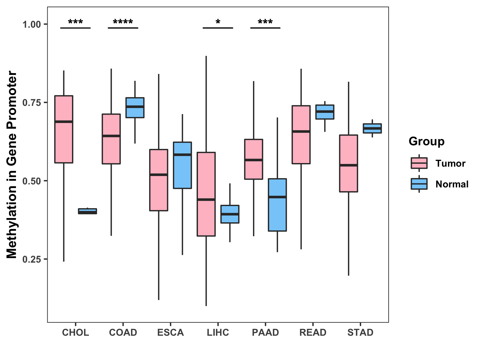 Boxplot of All Gastrointestinal Cancer ( * : 0.01-0.05 , ** : 0.005-0.01 , *** : 0.0001-0.005 , **** : < 0.0001 ) |