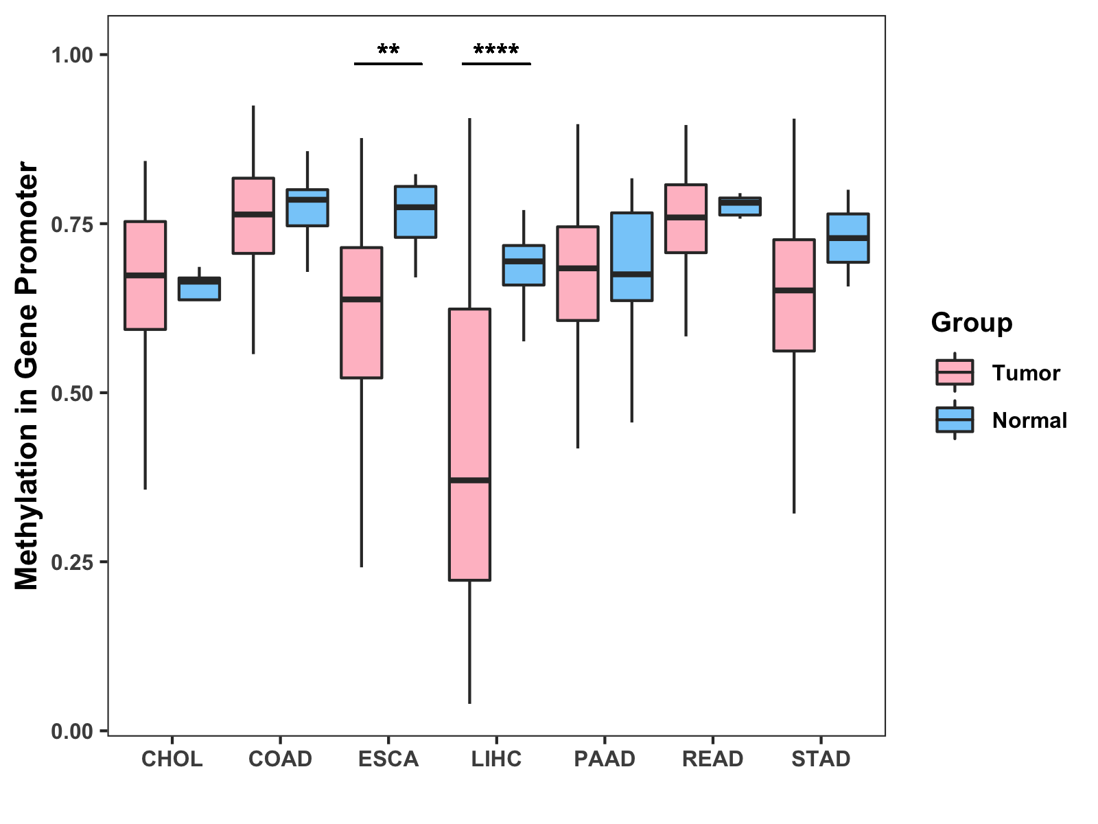 Boxplot of All Gastrointestinal Cancer ( * : 0.01-0.05 , ** : 0.005-0.01 , *** : 0.0001-0.005 , **** : < 0.0001 ) |