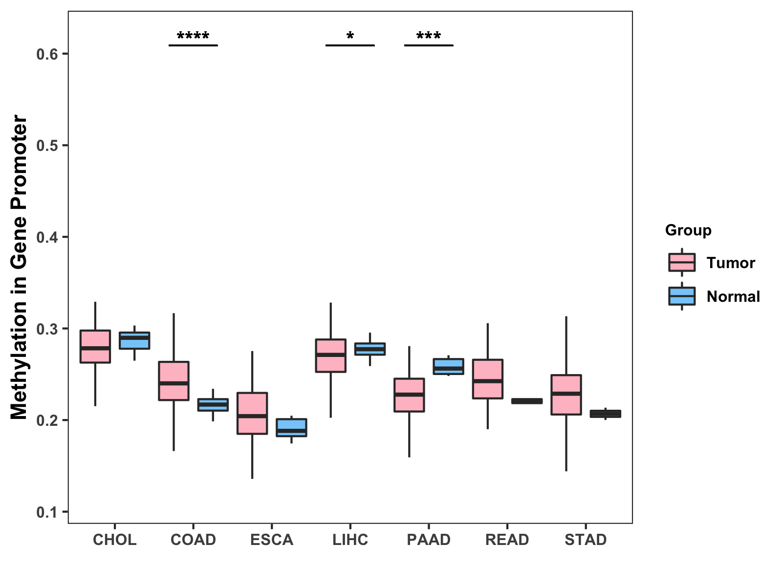 Boxplot of All Gastrointestinal Cancer ( * : 0.01-0.05 , ** : 0.005-0.01 , *** : 0.0001-0.005 , **** : < 0.0001 ) |