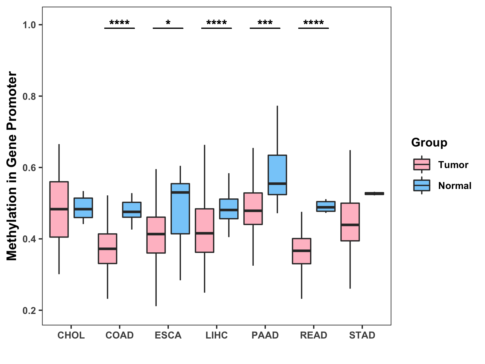 Boxplot of All Gastrointestinal Cancer ( * : 0.01-0.05 , ** : 0.005-0.01 , *** : 0.0001-0.005 , **** : < 0.0001 ) |