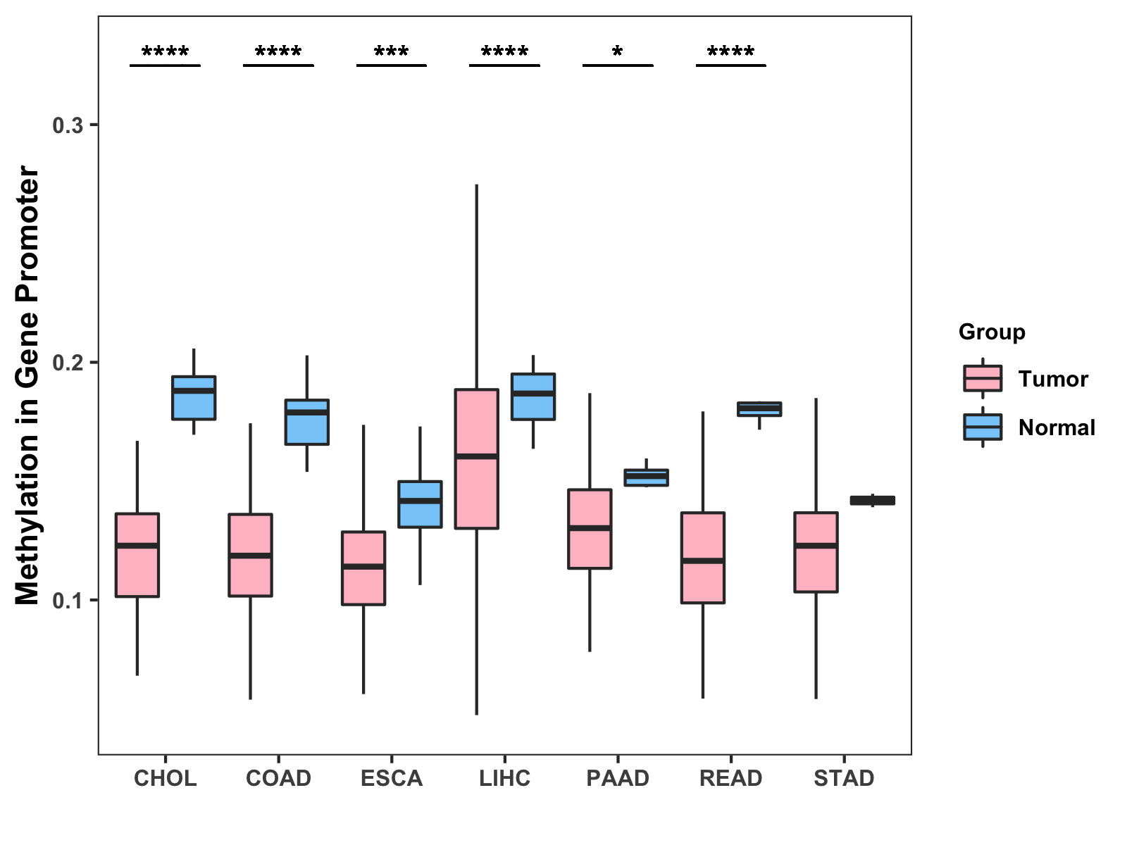 Boxplot of All Gastrointestinal Cancer ( * : 0.01-0.05 , ** : 0.005-0.01 , *** : 0.0001-0.005 , **** : < 0.0001 ) |