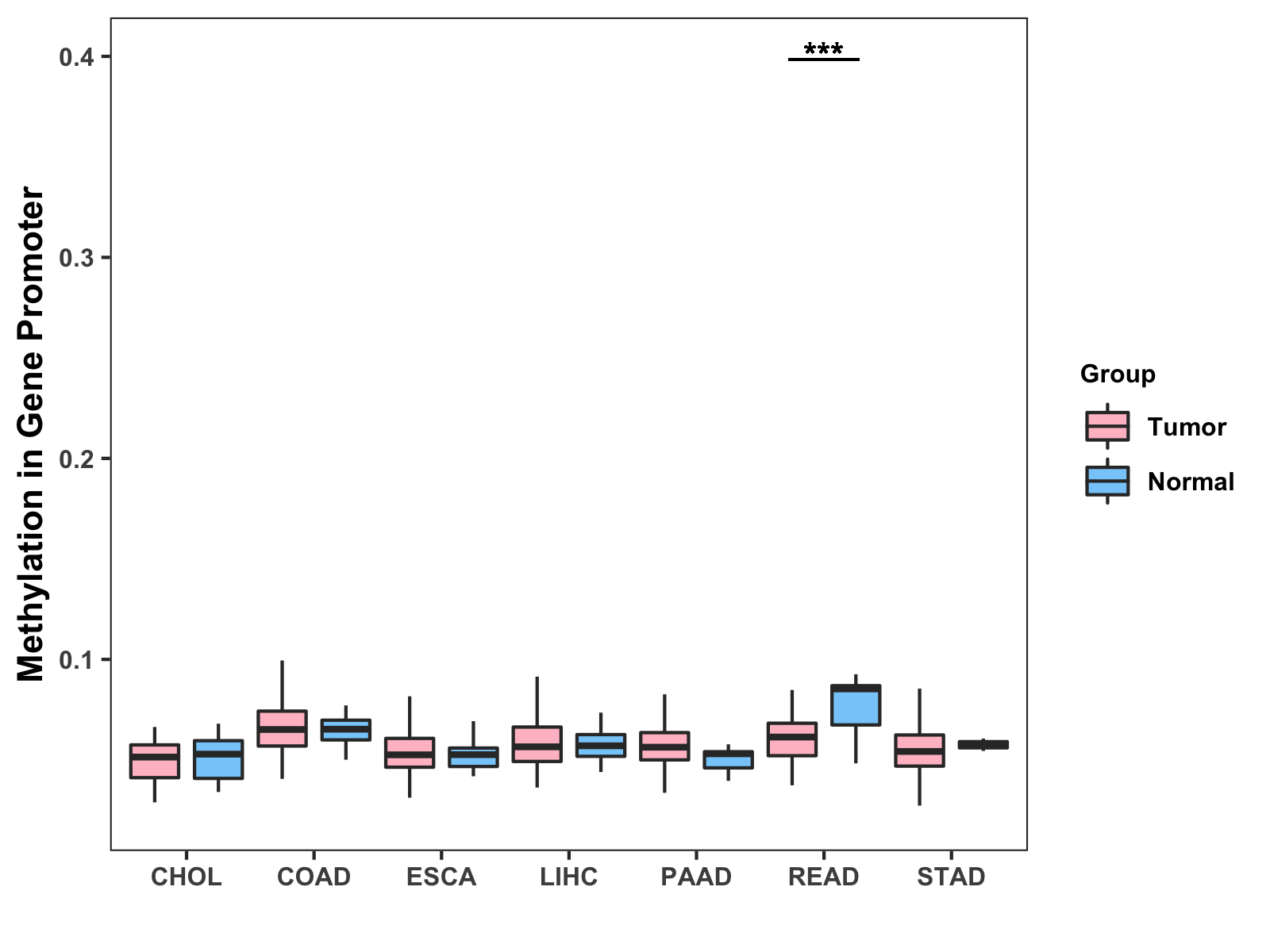 Boxplot of All Gastrointestinal Cancer ( * : 0.01-0.05 , ** : 0.005-0.01 , *** : 0.0001-0.005 , **** : < 0.0001 ) |
