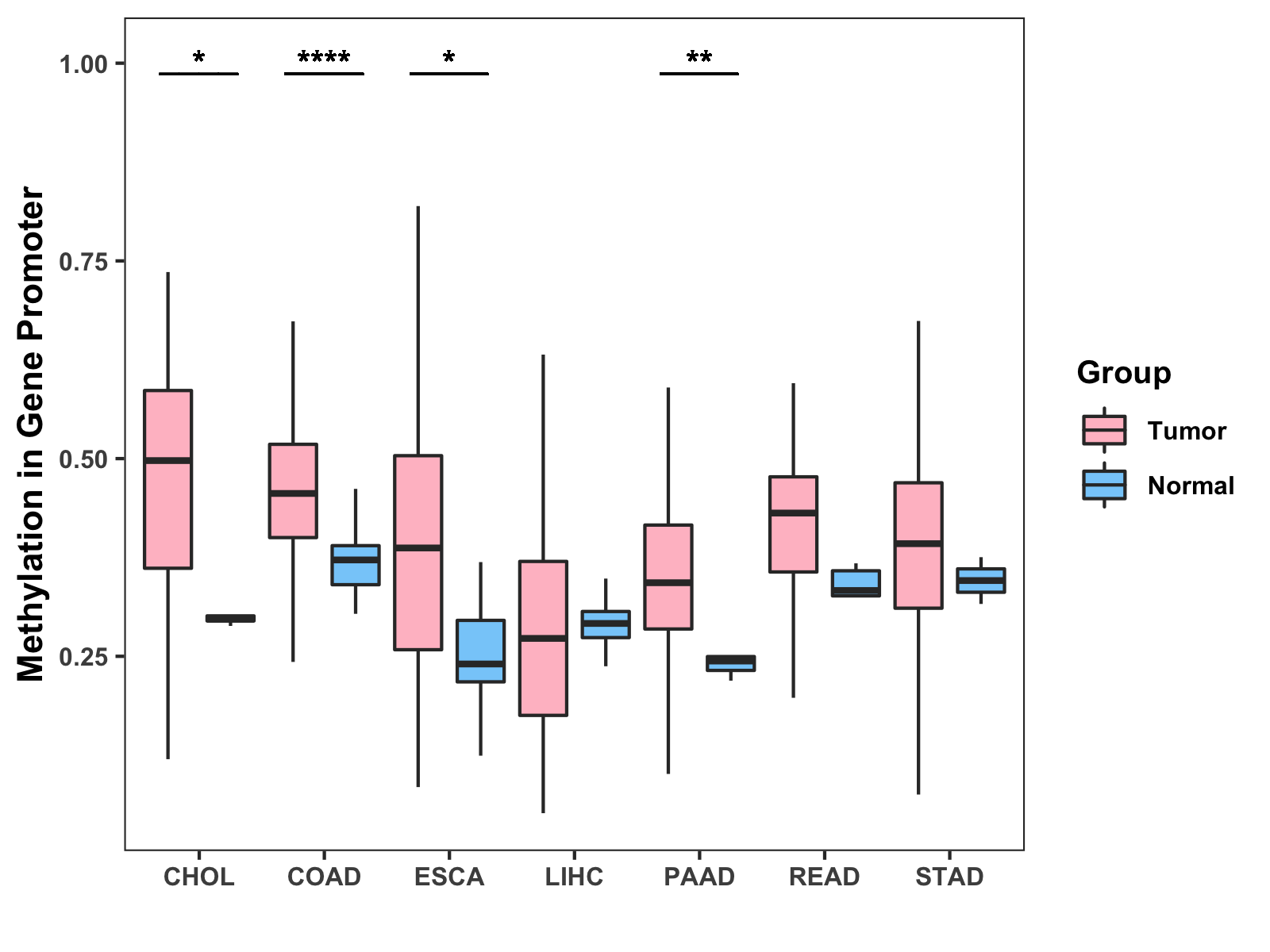 Boxplot of All Gastrointestinal Cancer ( * : 0.01-0.05 , ** : 0.005-0.01 , *** : 0.0001-0.005 , **** : < 0.0001 ) |