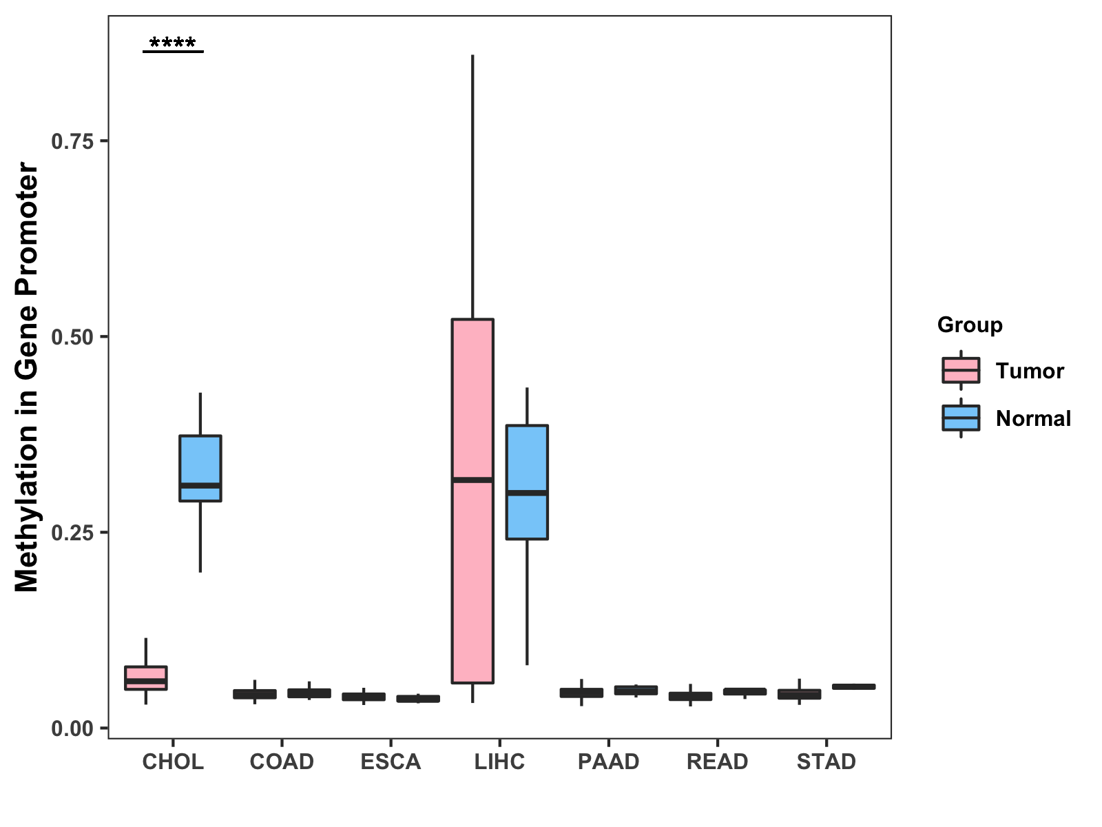 Boxplot of All Gastrointestinal Cancer ( * : 0.01-0.05 , ** : 0.005-0.01 , *** : 0.0001-0.005 , **** : < 0.0001 ) |