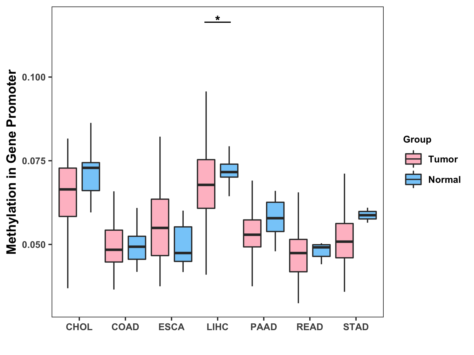 Boxplot of All Gastrointestinal Cancer ( * : 0.01-0.05 , ** : 0.005-0.01 , *** : 0.0001-0.005 , **** : < 0.0001 ) |