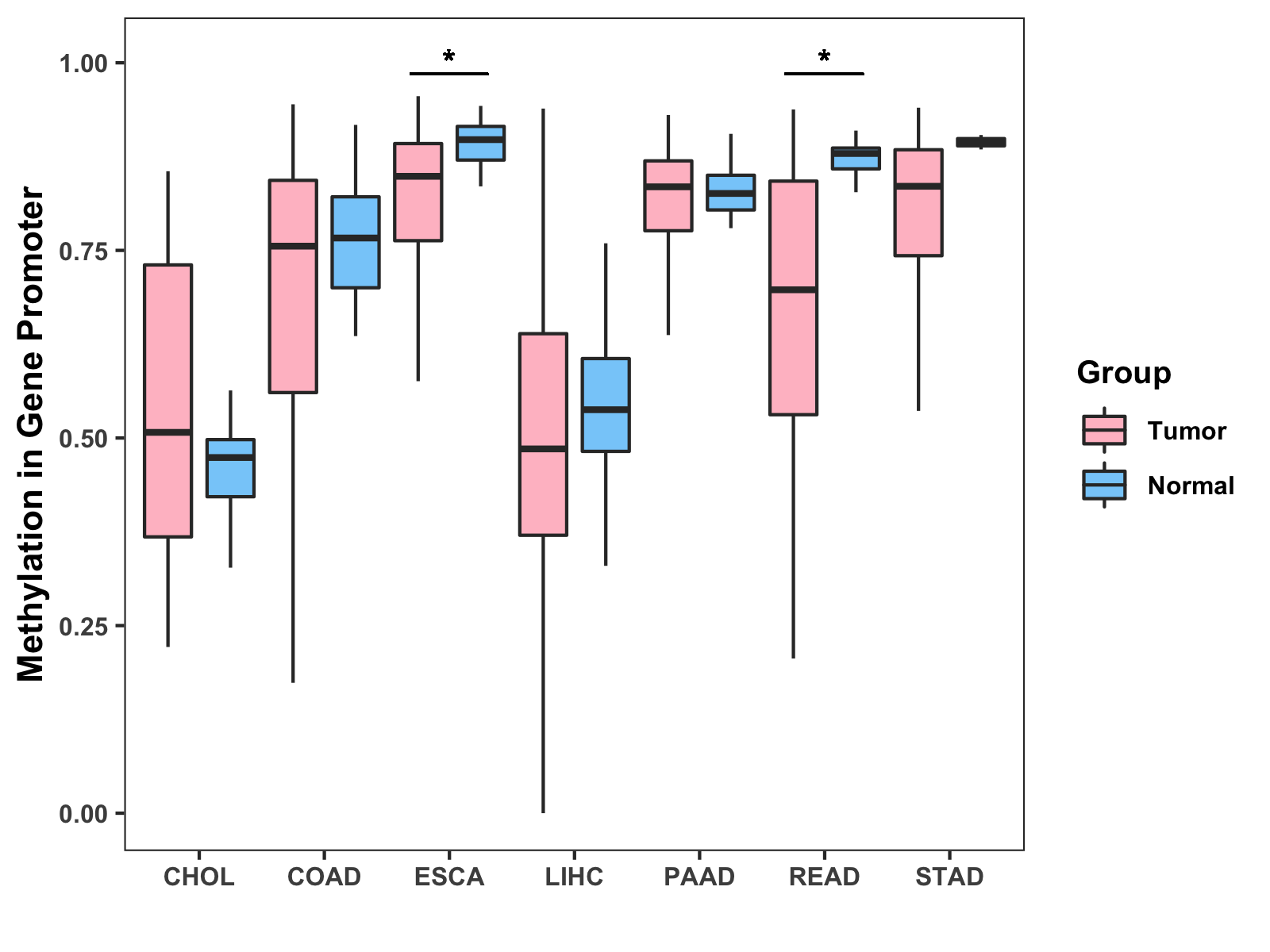 Boxplot of All Gastrointestinal Cancer ( * : 0.01-0.05 , ** : 0.005-0.01 , *** : 0.0001-0.005 , **** : < 0.0001 ) |
