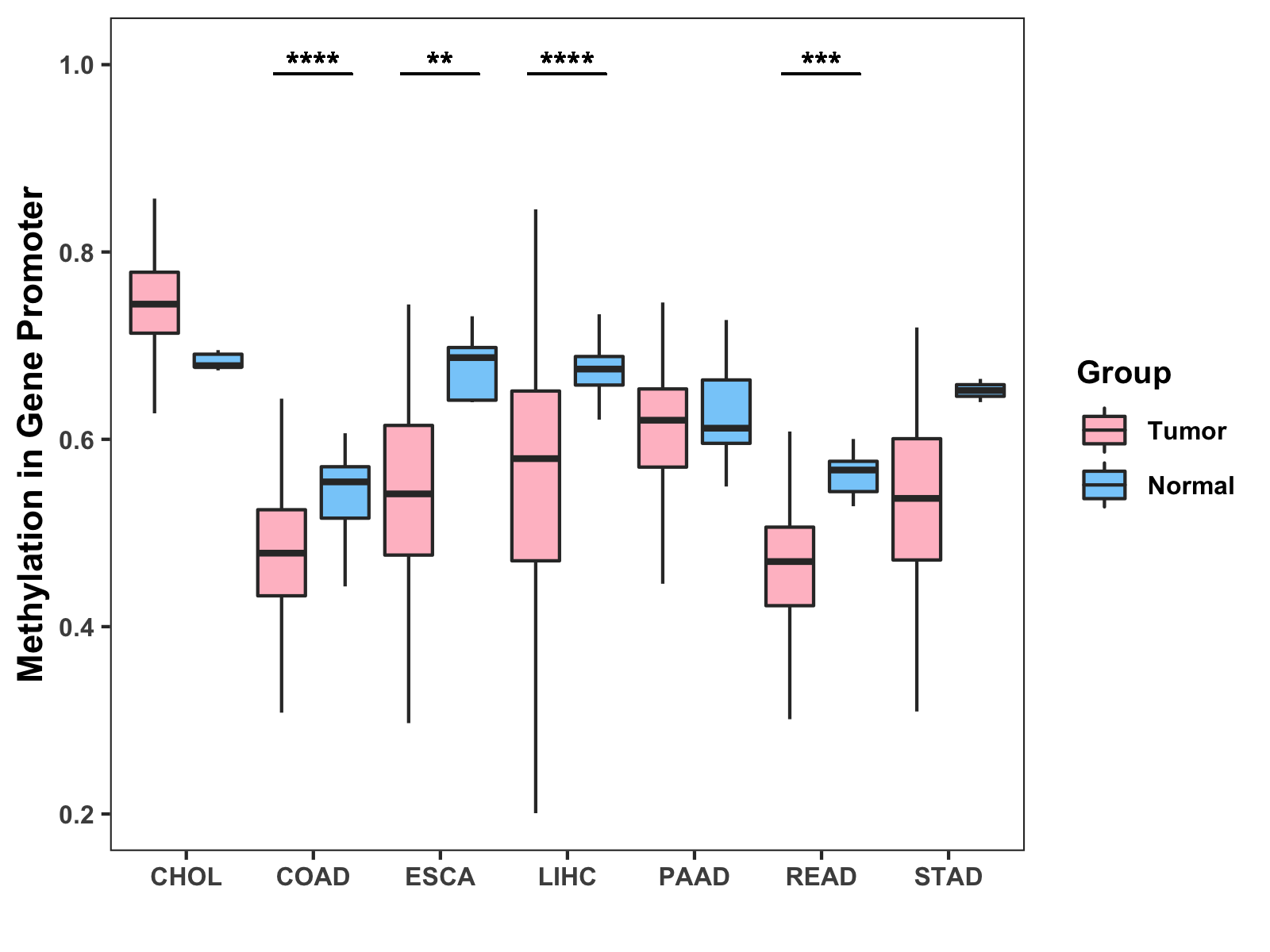 Boxplot of All Gastrointestinal Cancer ( * : 0.01-0.05 , ** : 0.005-0.01 , *** : 0.0001-0.005 , **** : < 0.0001 ) |