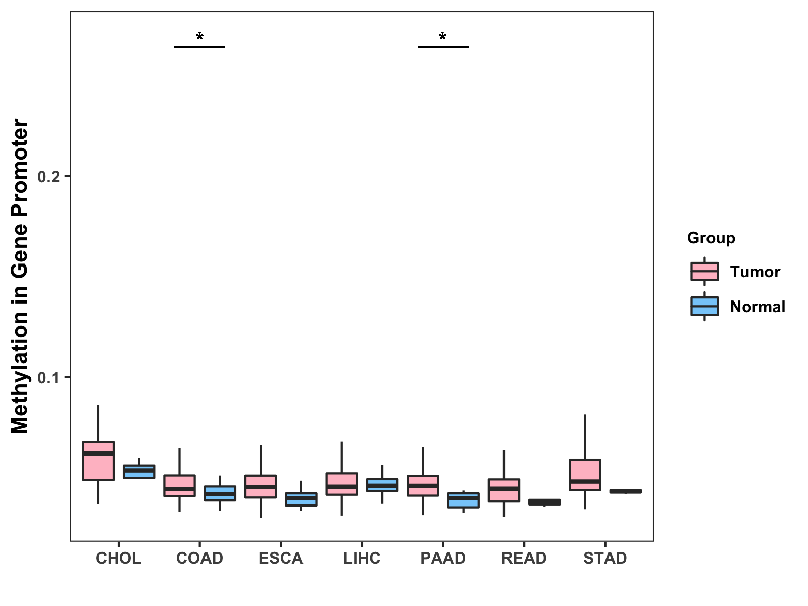 Boxplot of All Gastrointestinal Cancer ( * : 0.01-0.05 , ** : 0.005-0.01 , *** : 0.0001-0.005 , **** : < 0.0001 ) |