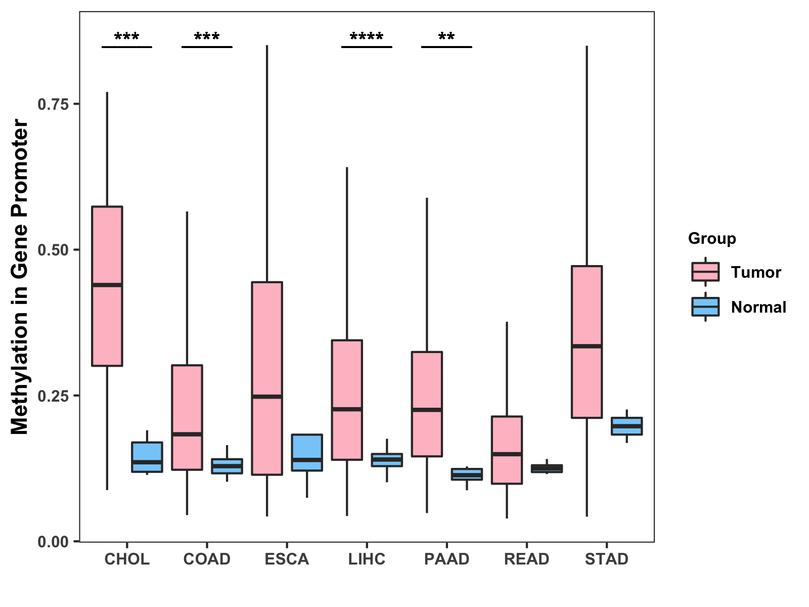 Boxplot of All Gastrointestinal Cancer ( * : 0.01-0.05 , ** : 0.005-0.01 , *** : 0.0001-0.005 , **** : < 0.0001 ) |