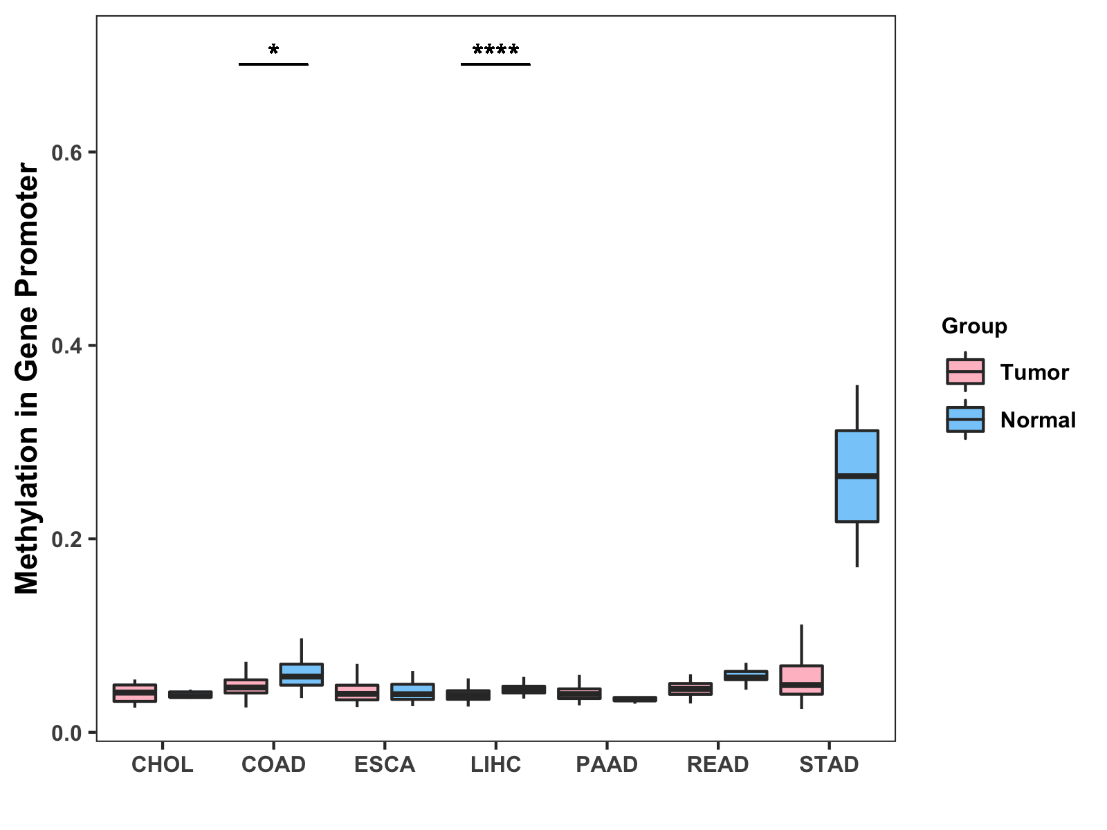 Boxplot of All Gastrointestinal Cancer ( * : 0.01-0.05 , ** : 0.005-0.01 , *** : 0.0001-0.005 , **** : < 0.0001 ) |