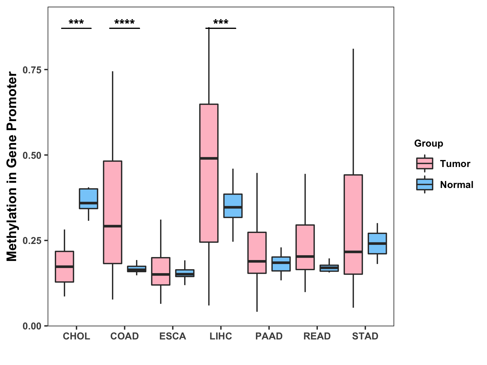 Boxplot of All Gastrointestinal Cancer ( * : 0.01-0.05 , ** : 0.005-0.01 , *** : 0.0001-0.005 , **** : < 0.0001 ) |