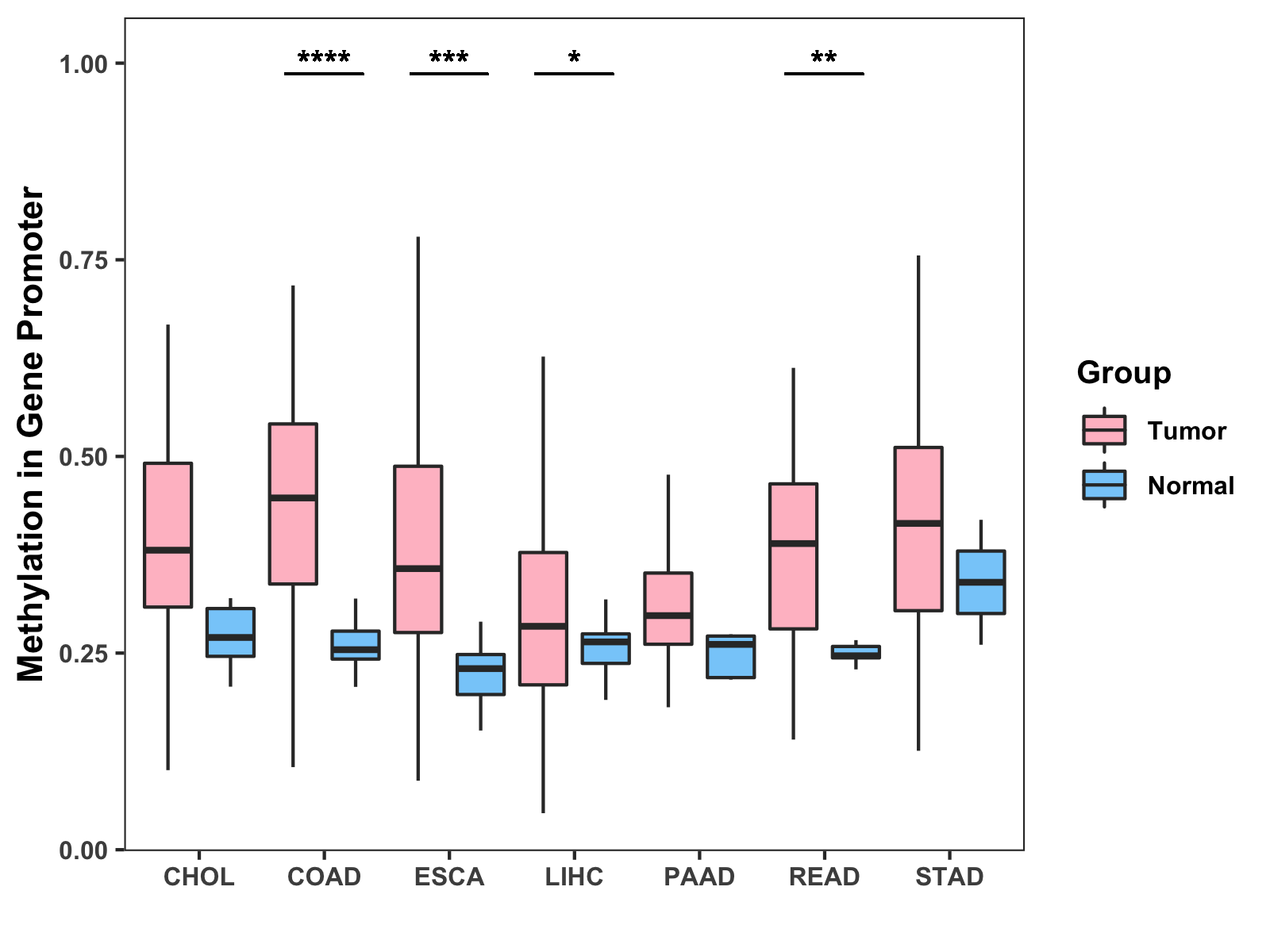 Boxplot of All Gastrointestinal Cancer ( * : 0.01-0.05 , ** : 0.005-0.01 , *** : 0.0001-0.005 , **** : < 0.0001 ) |