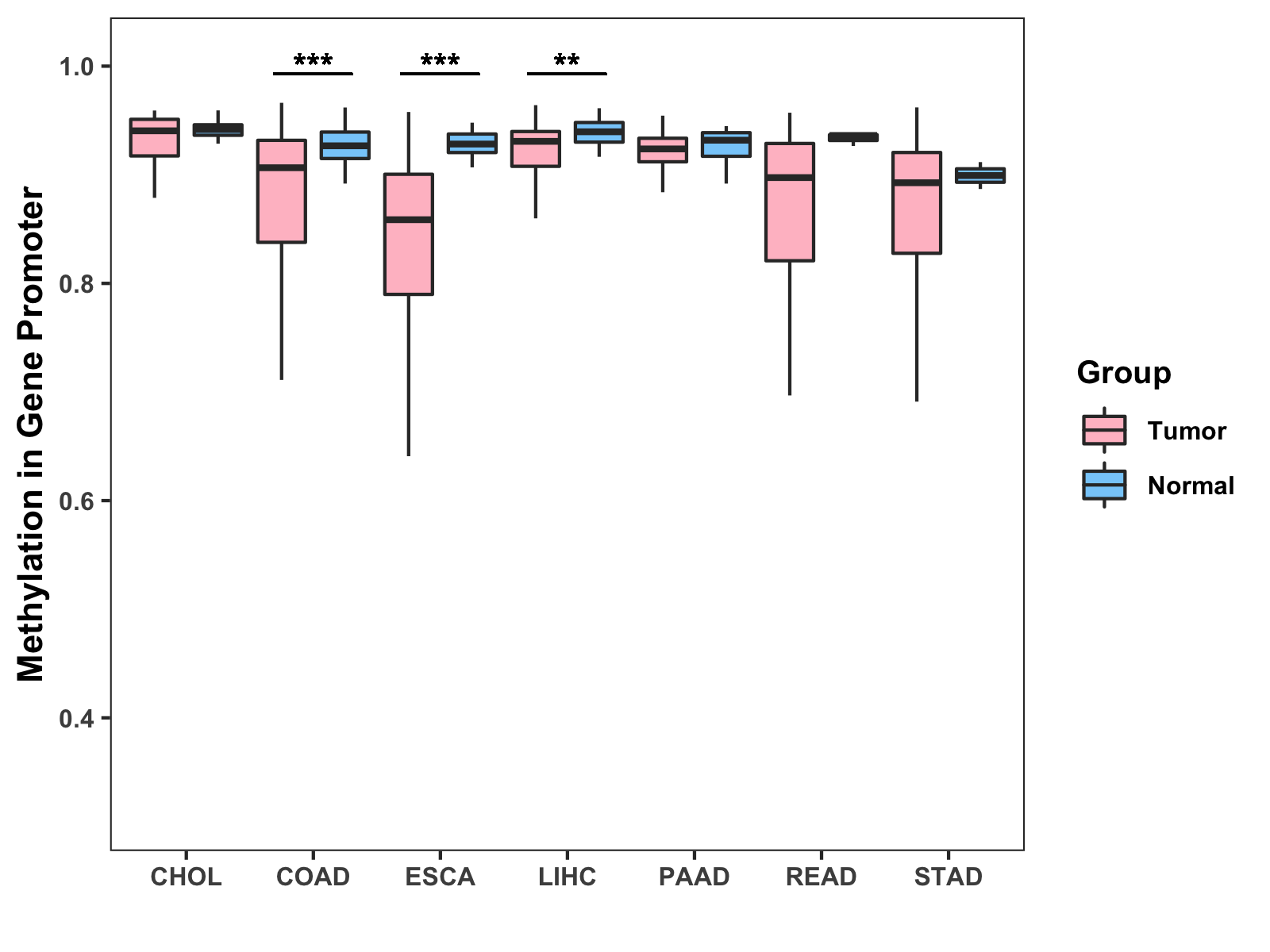 Boxplot of All Gastrointestinal Cancer ( * : 0.01-0.05 , ** : 0.005-0.01 , *** : 0.0001-0.005 , **** : < 0.0001 ) |