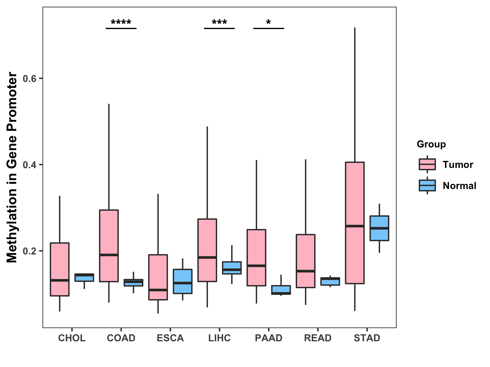 Boxplot of All Gastrointestinal Cancer ( * : 0.01-0.05 , ** : 0.005-0.01 , *** : 0.0001-0.005 , **** : < 0.0001 ) |
