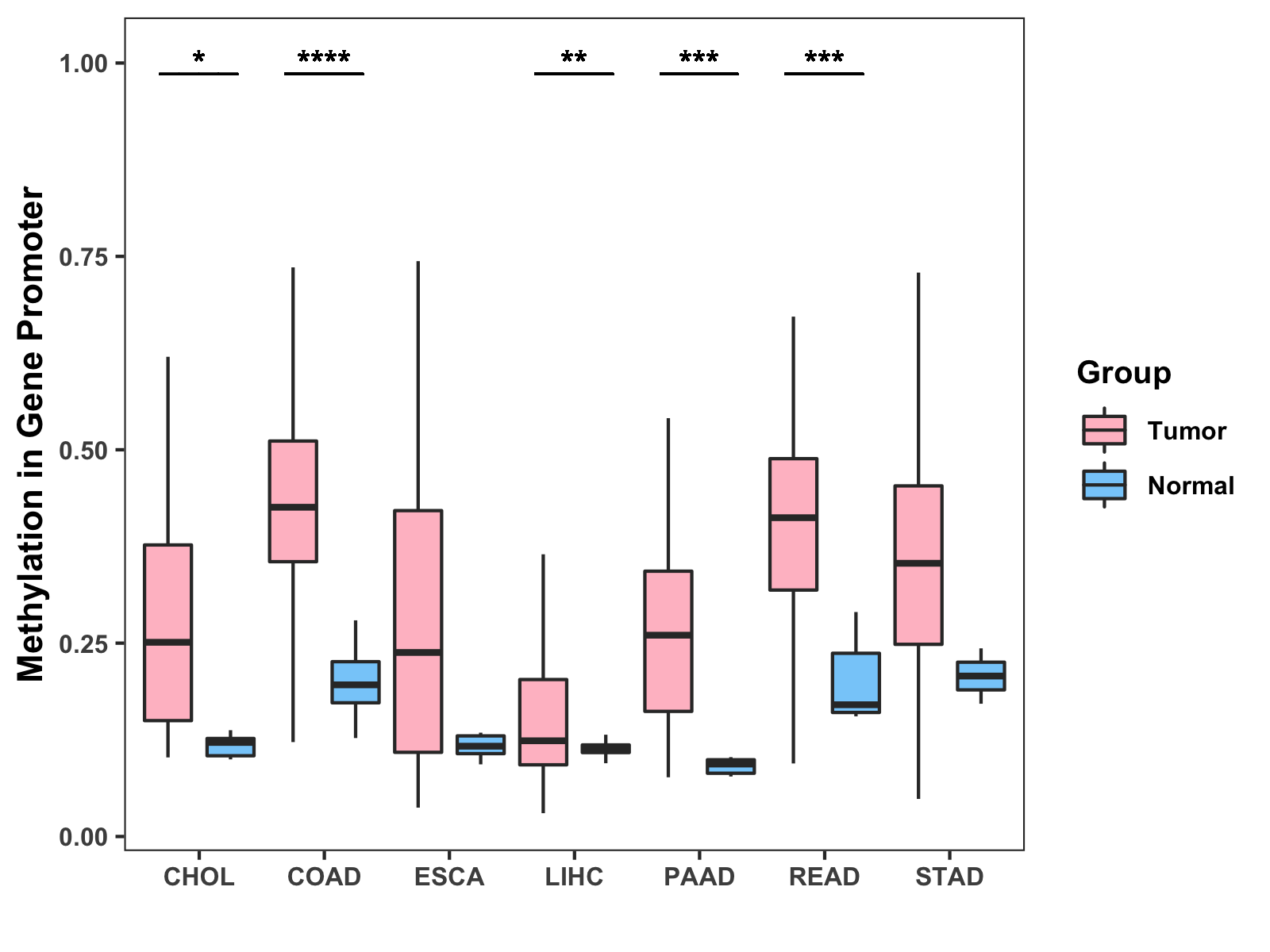 Boxplot of All Gastrointestinal Cancer ( * : 0.01-0.05 , ** : 0.005-0.01 , *** : 0.0001-0.005 , **** : < 0.0001 ) |