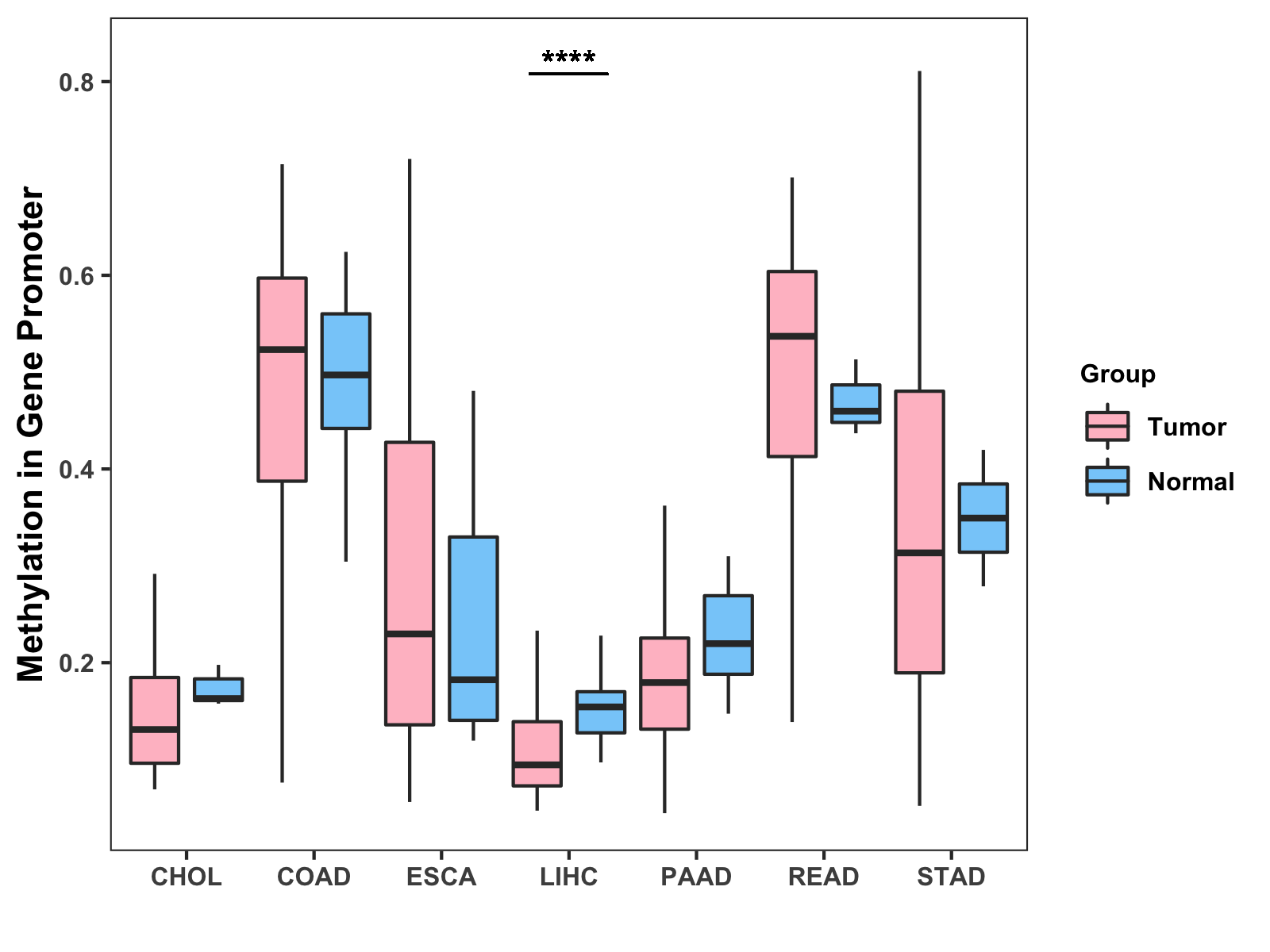 Boxplot of All Gastrointestinal Cancer ( * : 0.01-0.05 , ** : 0.005-0.01 , *** : 0.0001-0.005 , **** : < 0.0001 ) |
