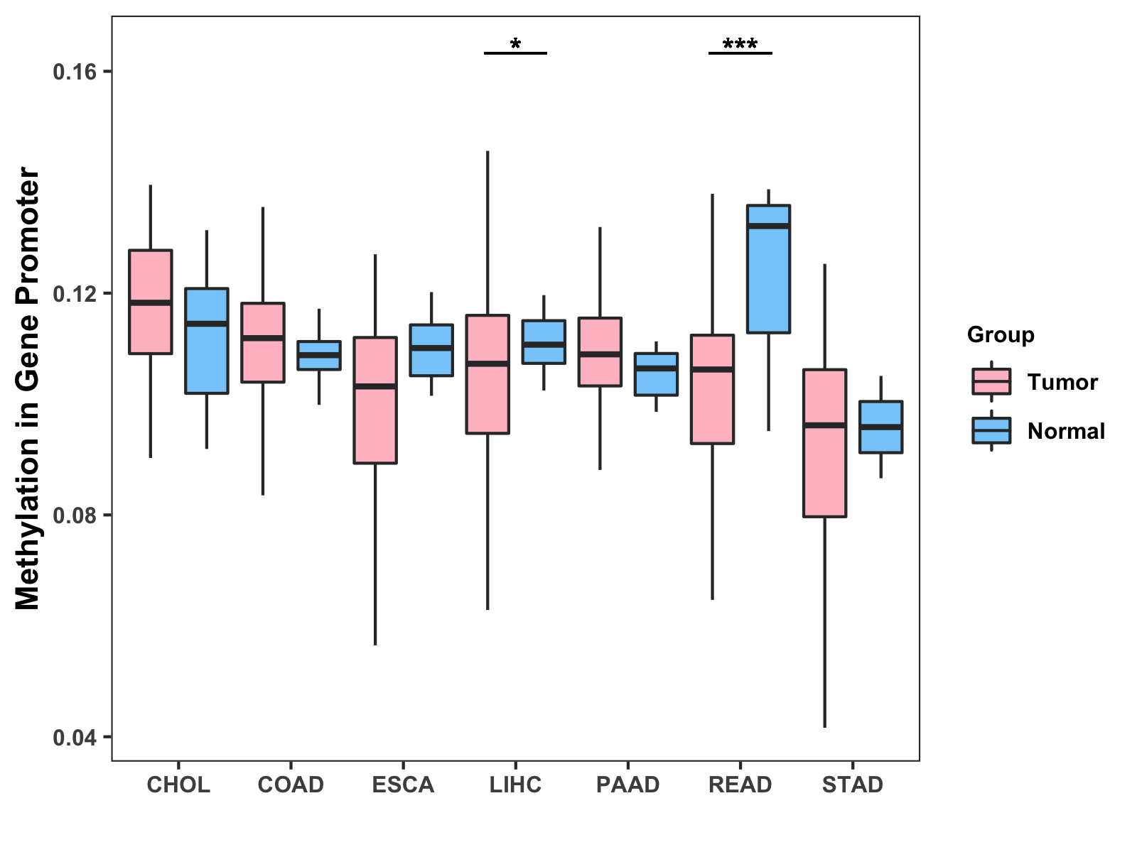Boxplot of All Gastrointestinal Cancer ( * : 0.01-0.05 , ** : 0.005-0.01 , *** : 0.0001-0.005 , **** : < 0.0001 ) |